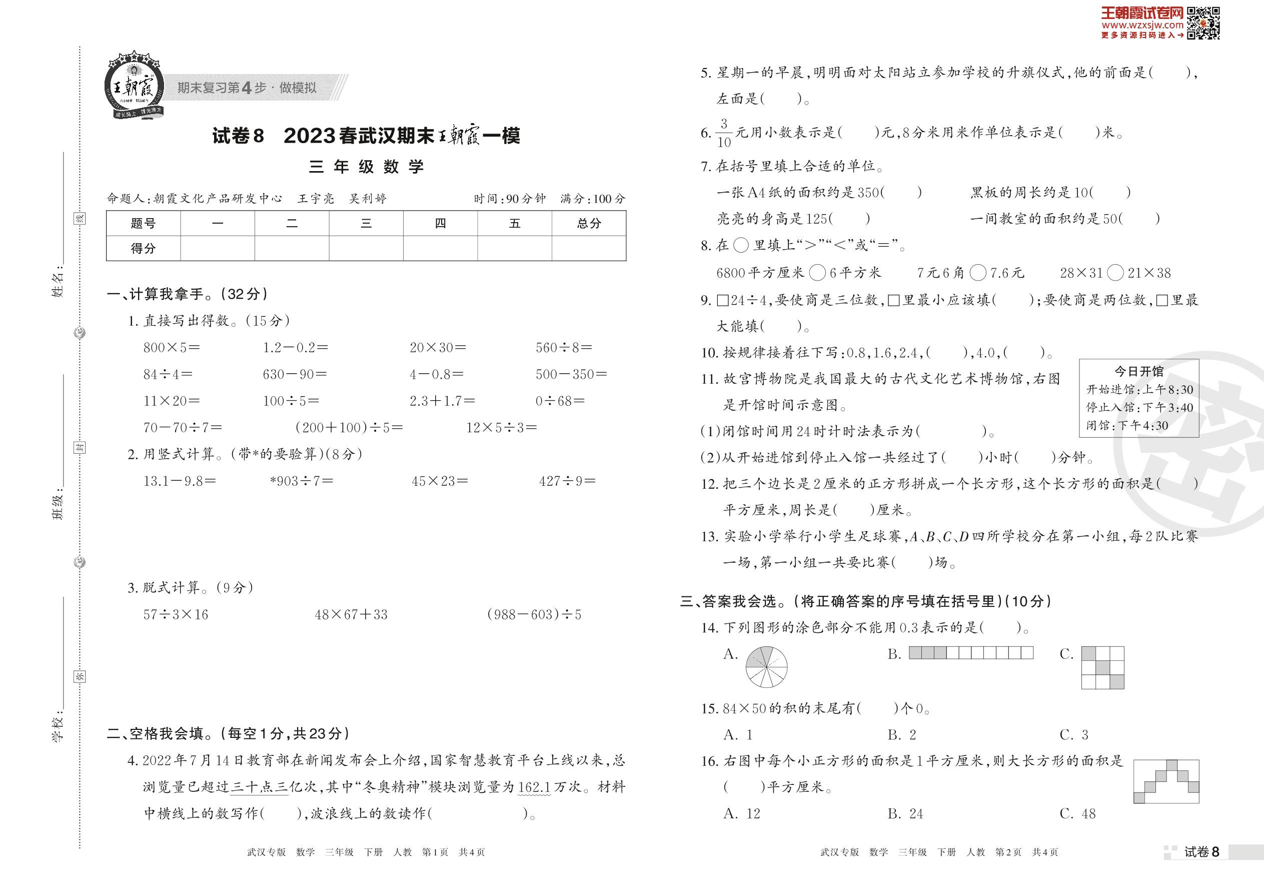 王朝霞期末模拟卷三年级下册数学(人教版)_R230420170711594【8】