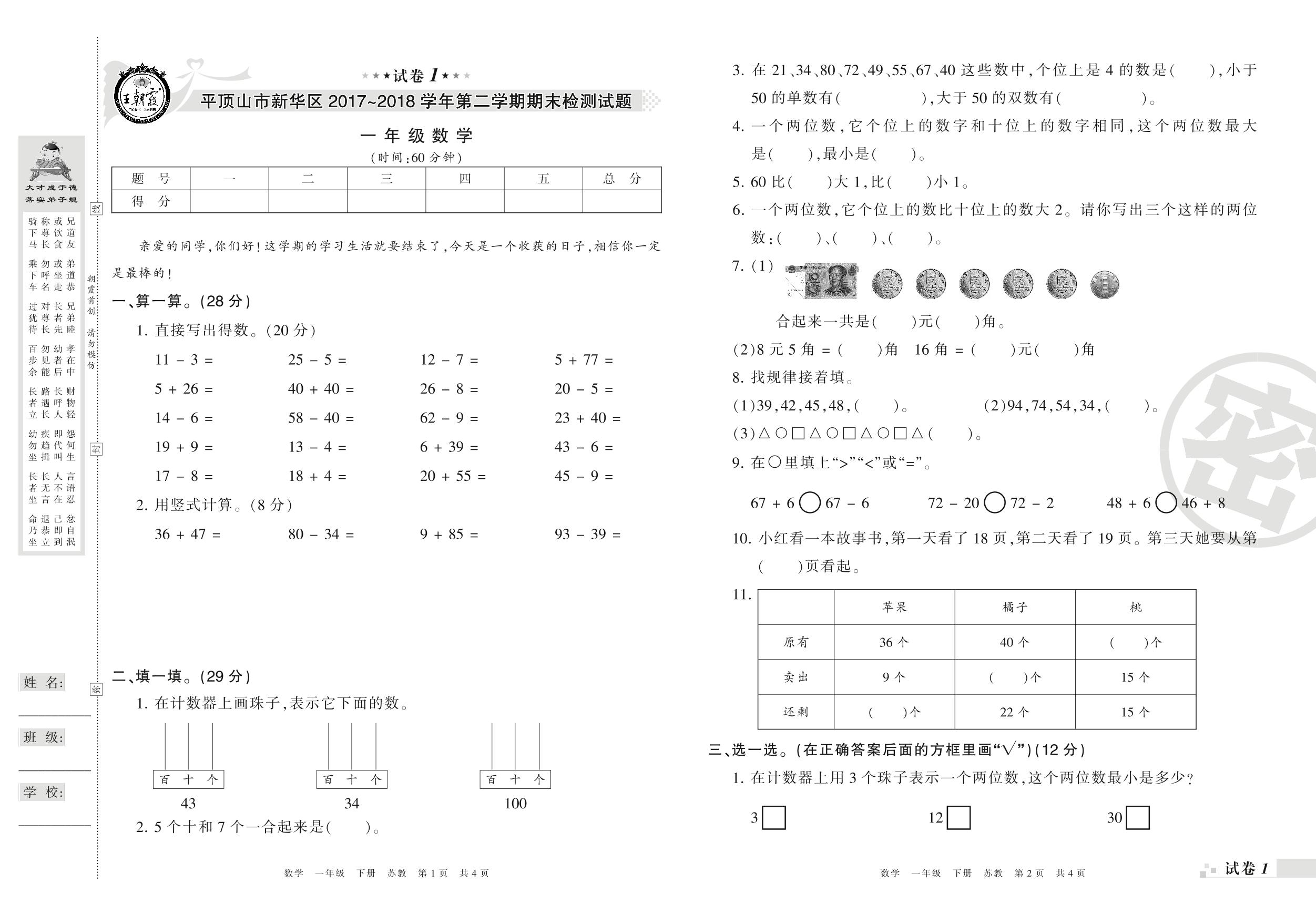 2017-2018学年第二学期平顶山市新华区一年级数学试卷(苏教版)【1】