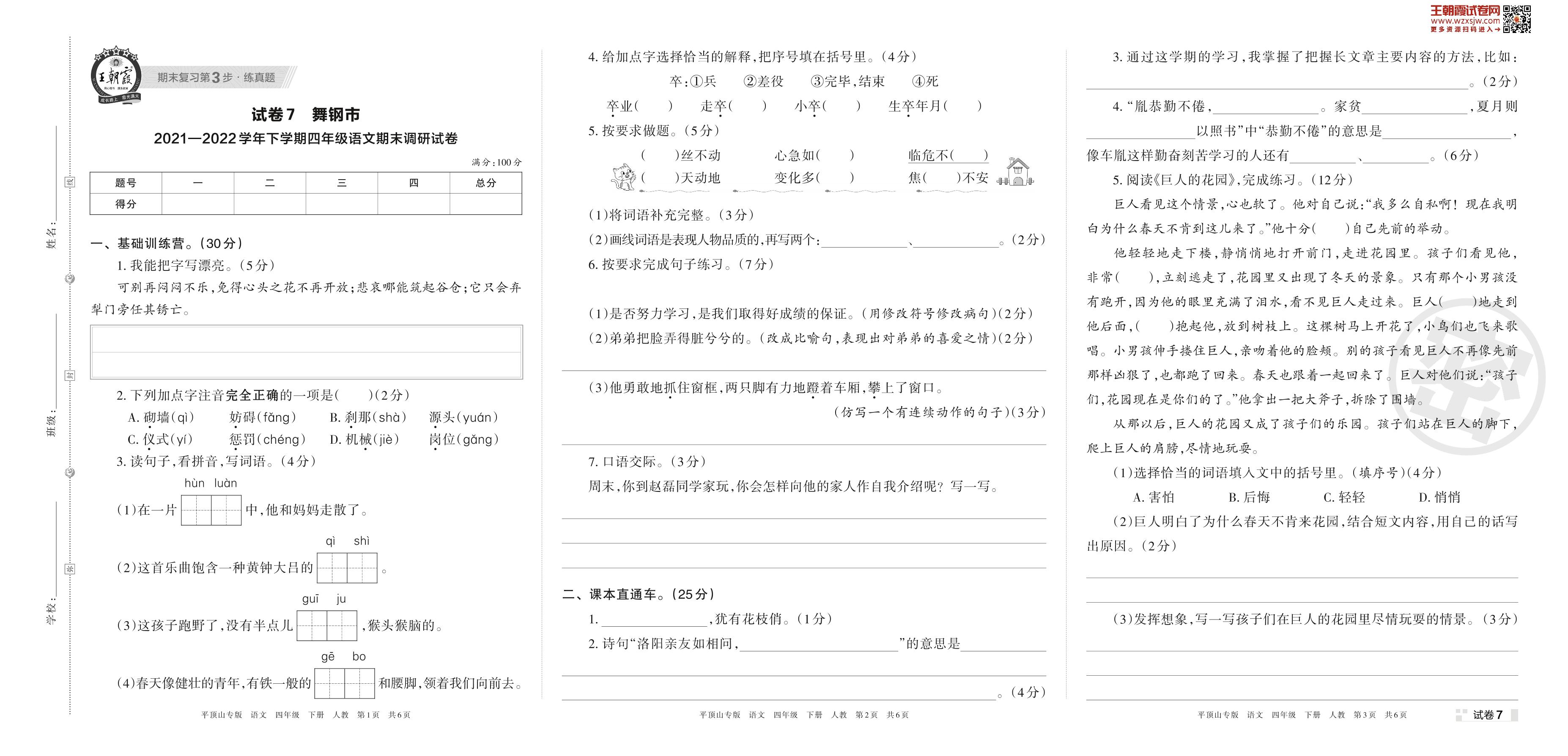 舞钢市2021—2022学年下学期四年级语文期末调研试卷(人教版)【7】