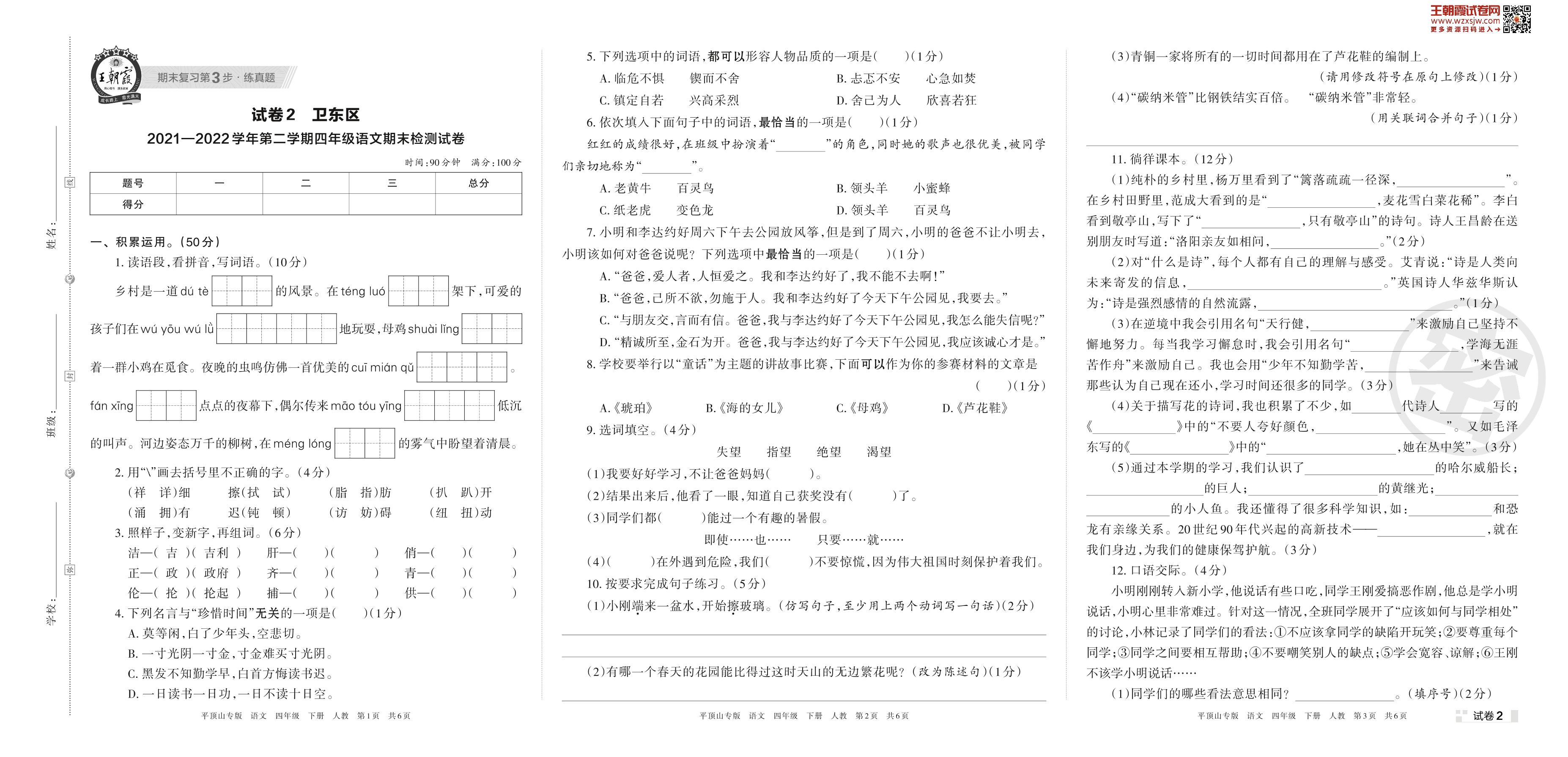 卫东区2021—2022学年第二学期四年级语文期末检测试卷(人教版)【2】