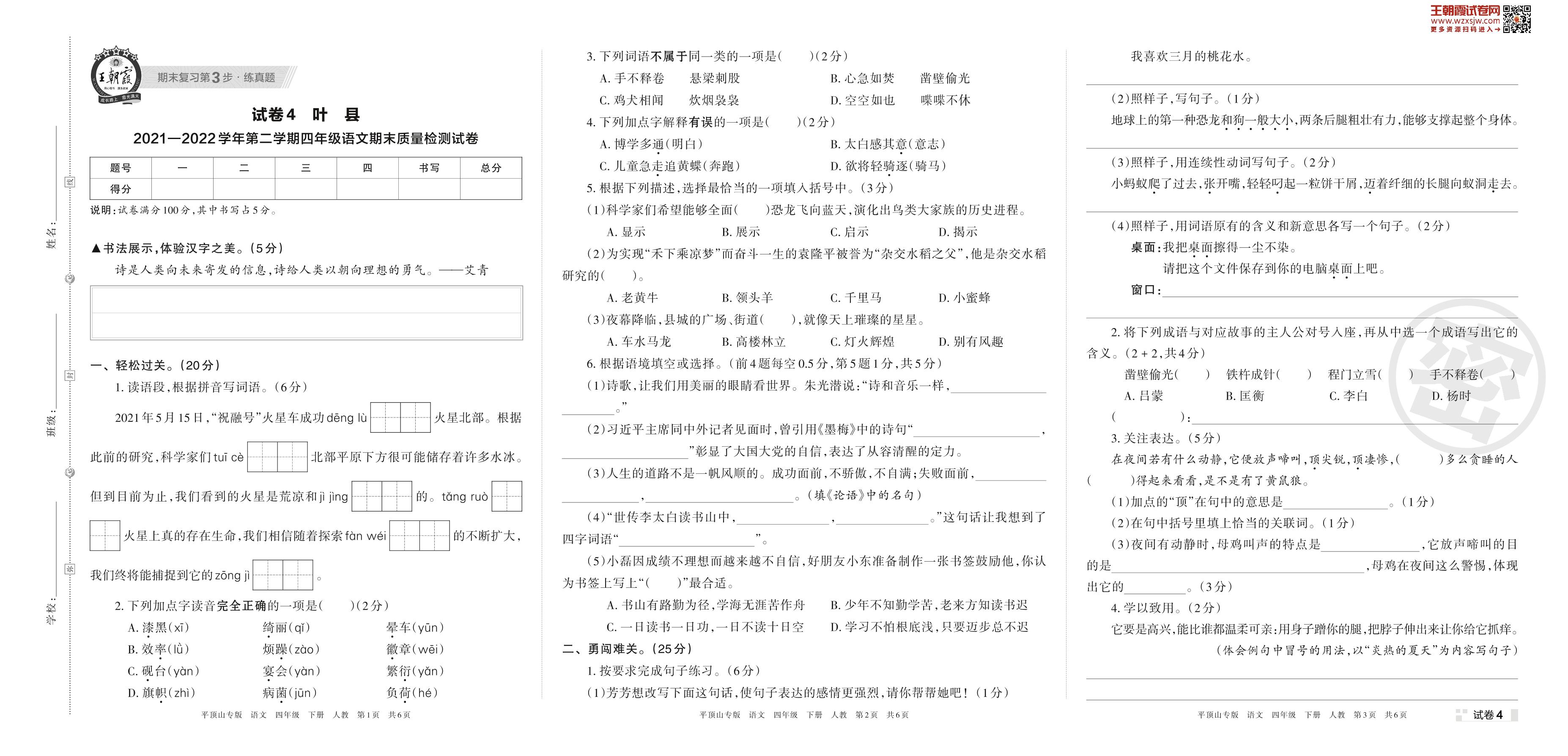 叶县2021—2022学年第二学期四年级语文期末质量检测试卷(人教版)【4】