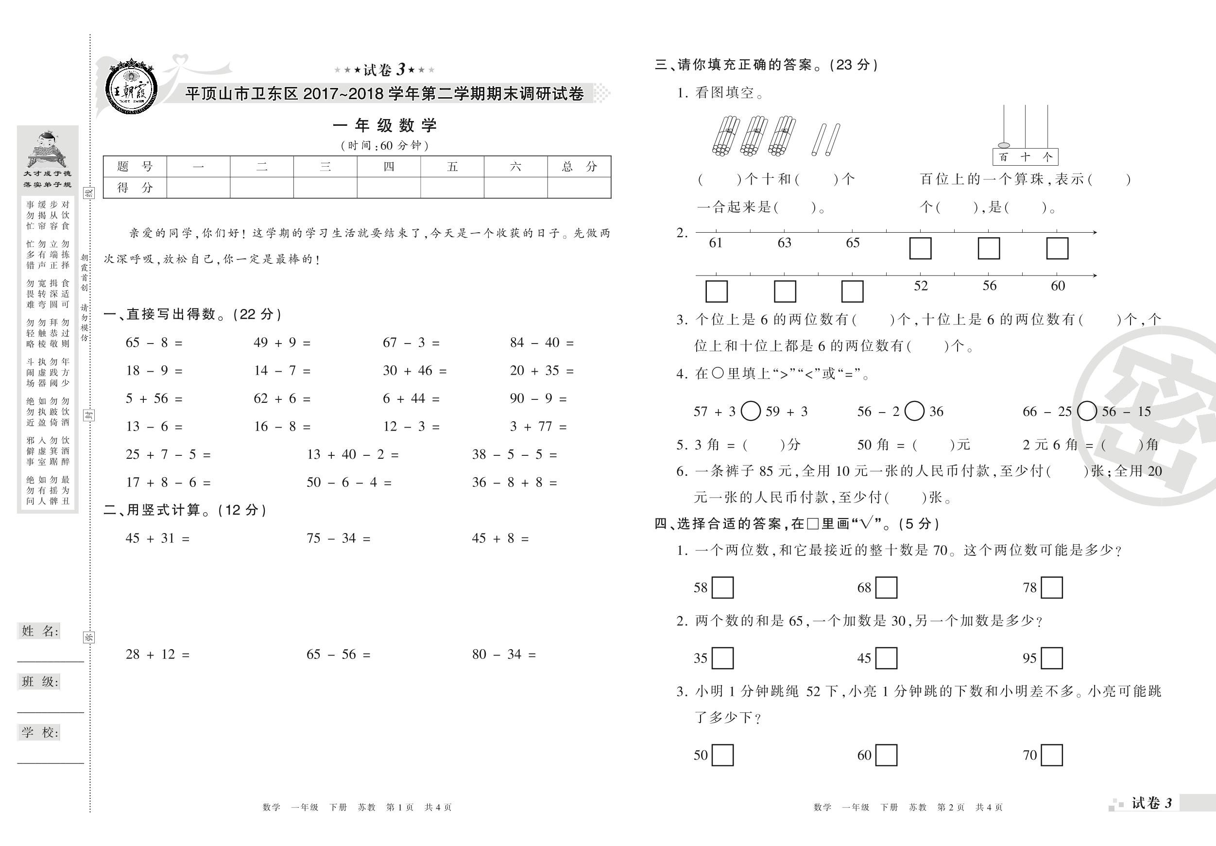 2017-2018学年第二学期平顶山市卫东区一年级数学试卷(苏教版)【3】