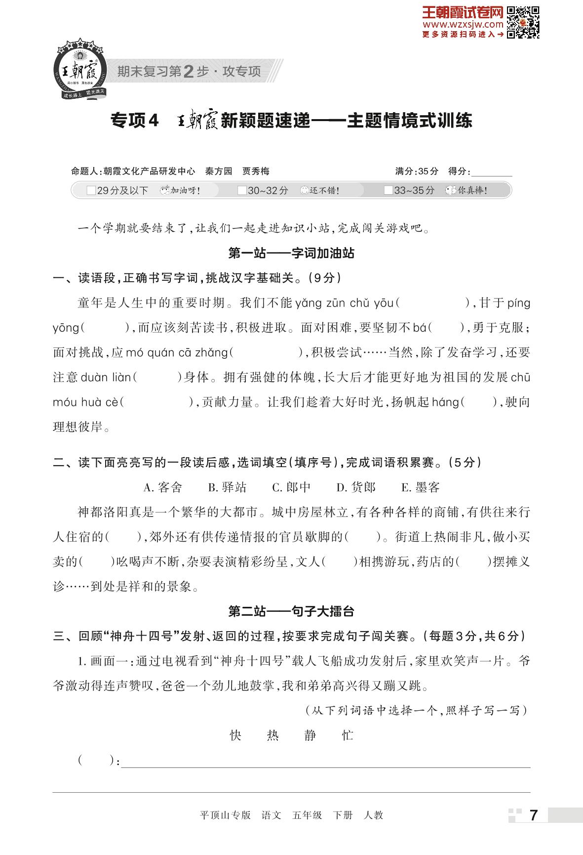 王朝霞期末专项卷——王朝霞新颖题速递:主题情境式训练五年级下册语文(人教版)_R230420171553570【4】