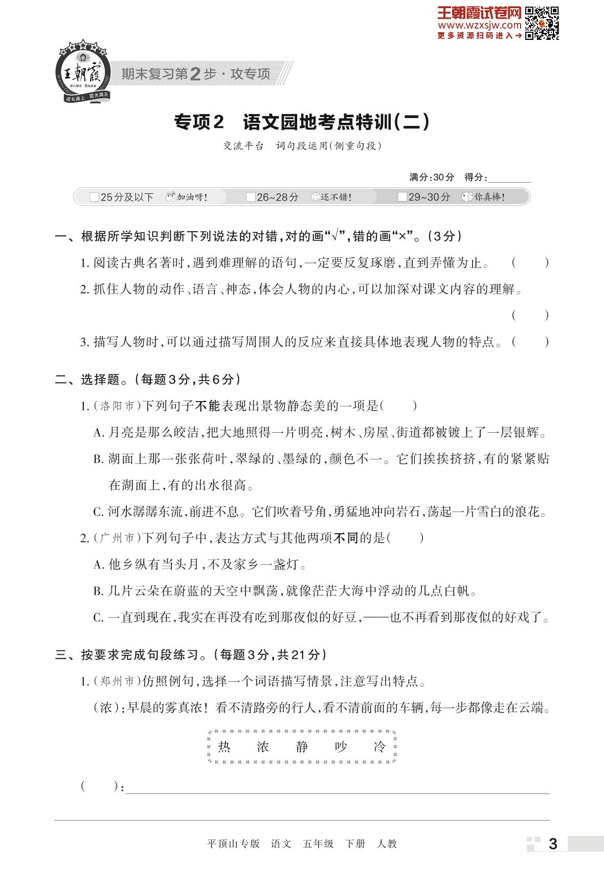 王朝霞期末专项卷——语文园地考点特训(二)五年级下册语文(人教版)_R230420171553764【2】