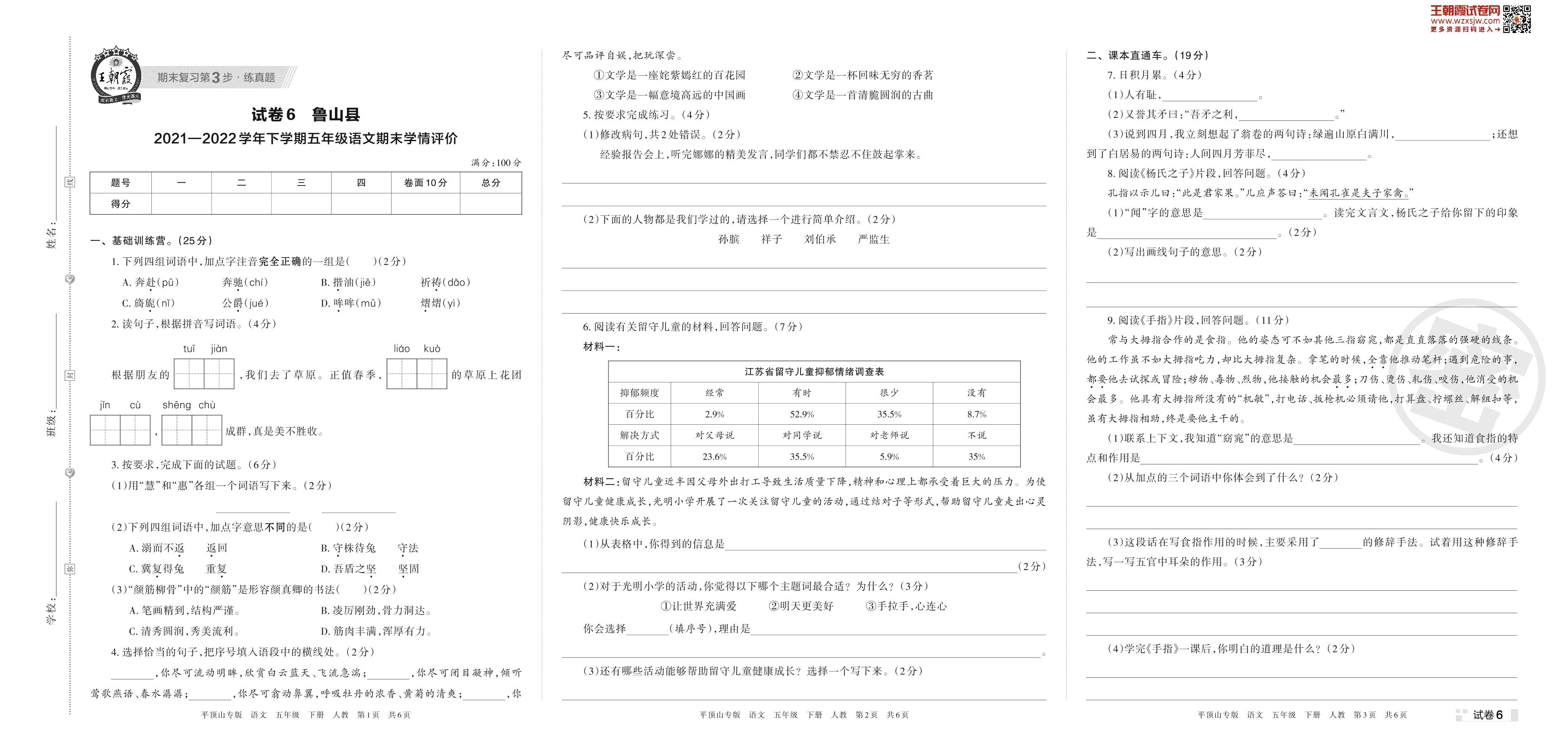 鲁山县2021—2022学年下学期五年级语文期末学情评价(人教版)【6】