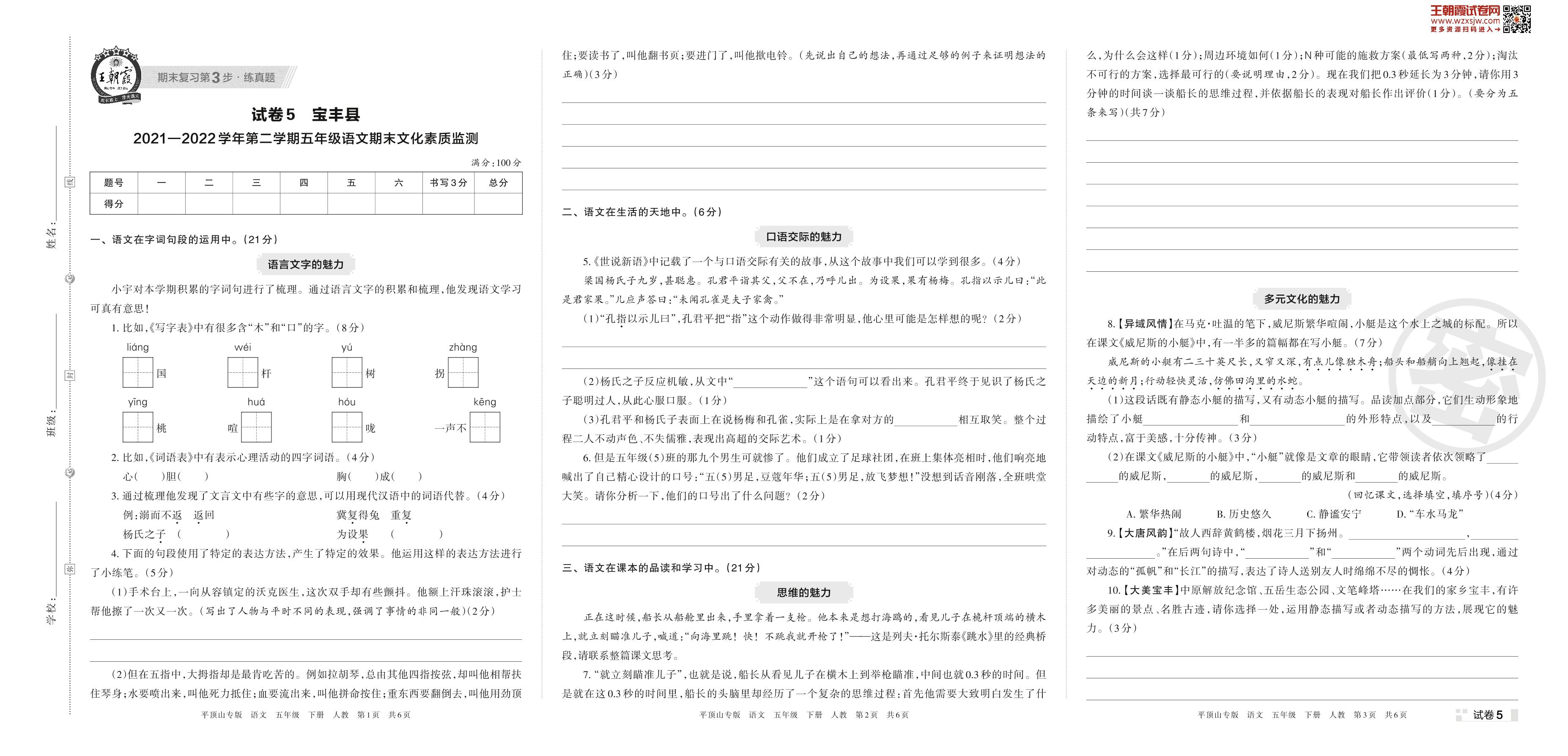 宝丰县2021—2022学年第二学期五年级语文期末文化素质监测(人教版)【5】