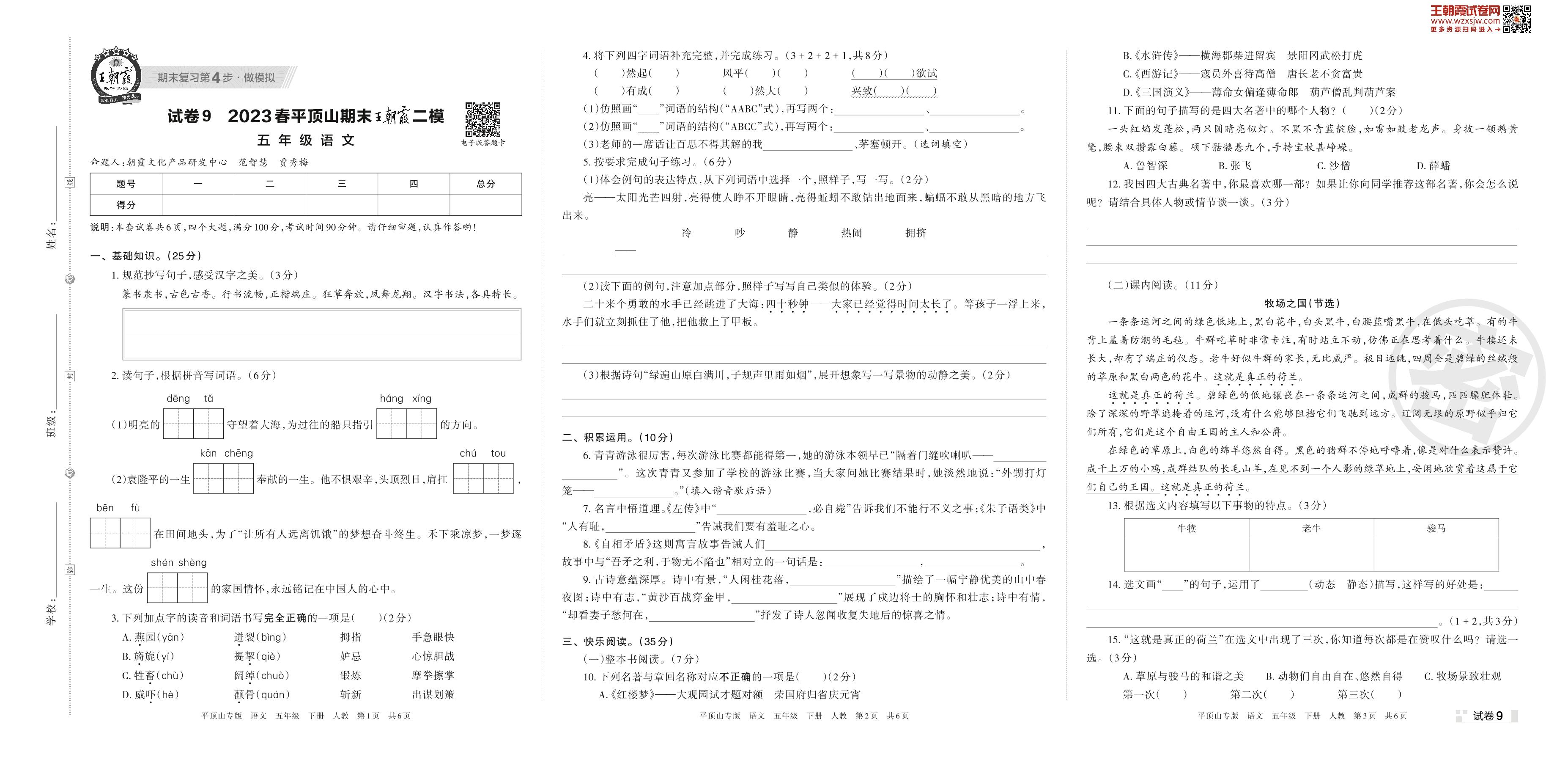王朝霞期末模拟卷五年级下册语文(人教版)_R230420171554175【9】