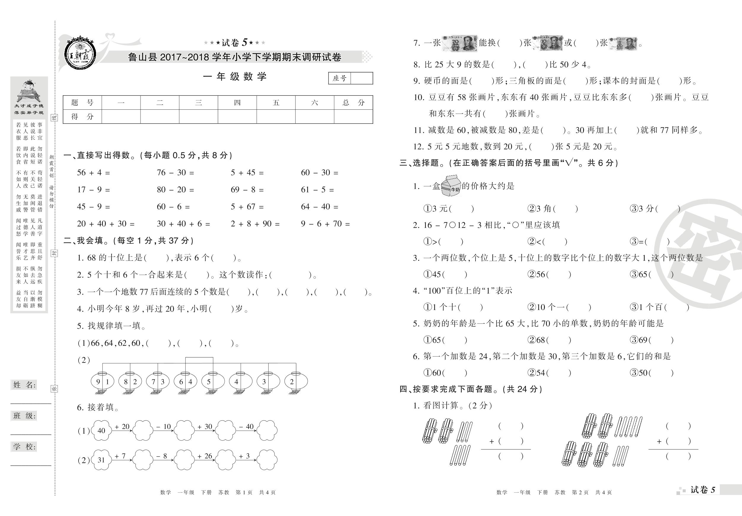 2017-2018学年第二学期平顶山市鲁山县一年级数学试卷(苏教版)【5】