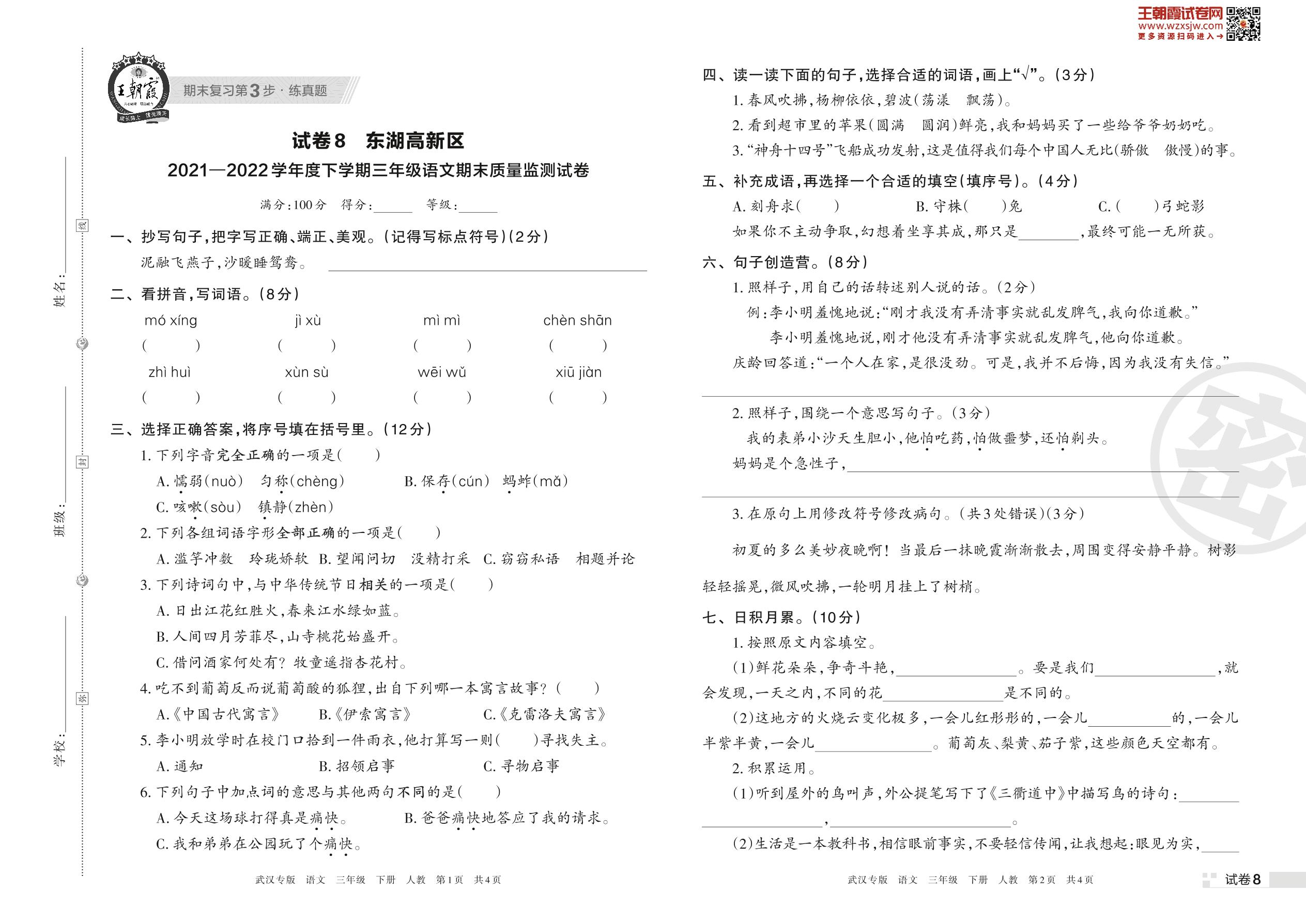 东湖高新区2021—2022学年度下学期三年级语文期末质量监测试卷(人教版)【8】