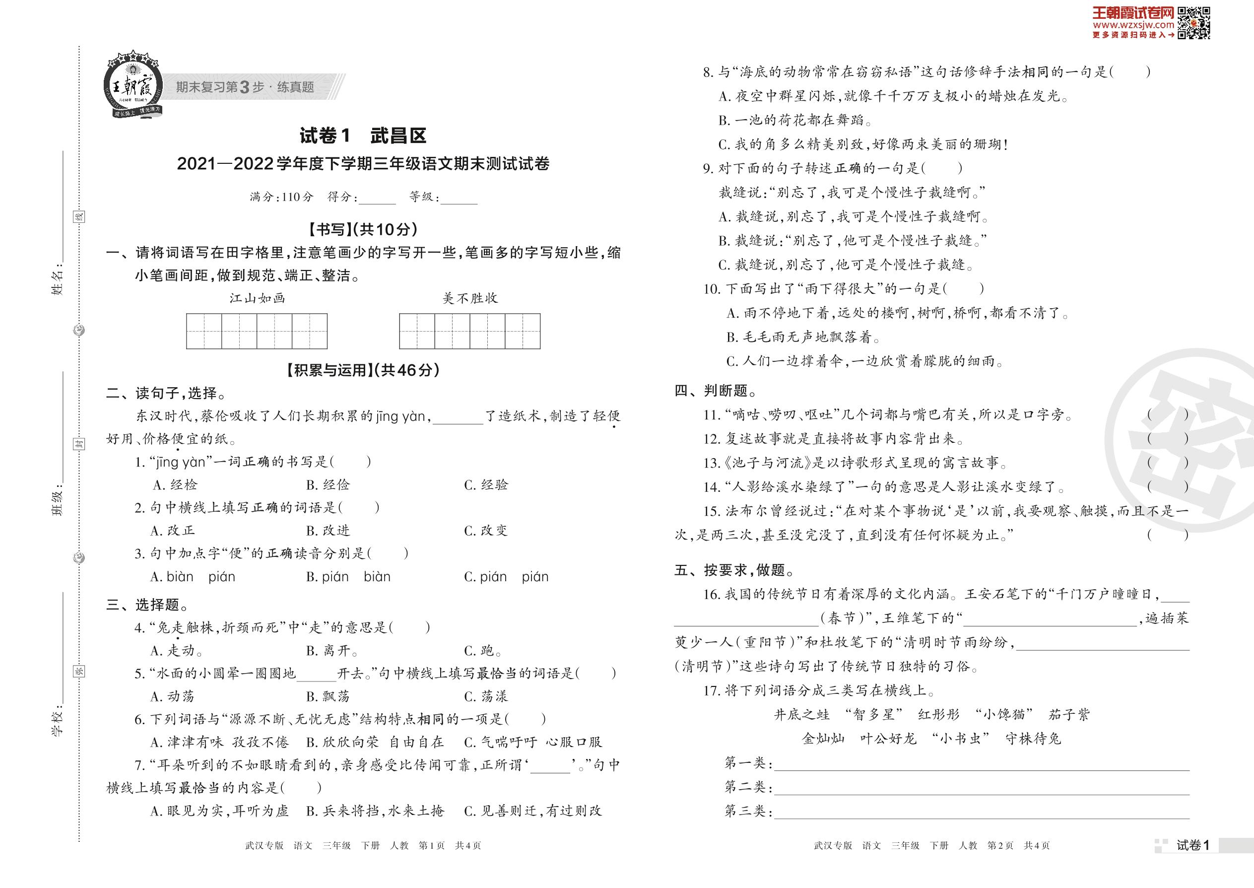 武昌区2021—2022学年度下学期三年级语文期末测试试卷(人教版)【1】
