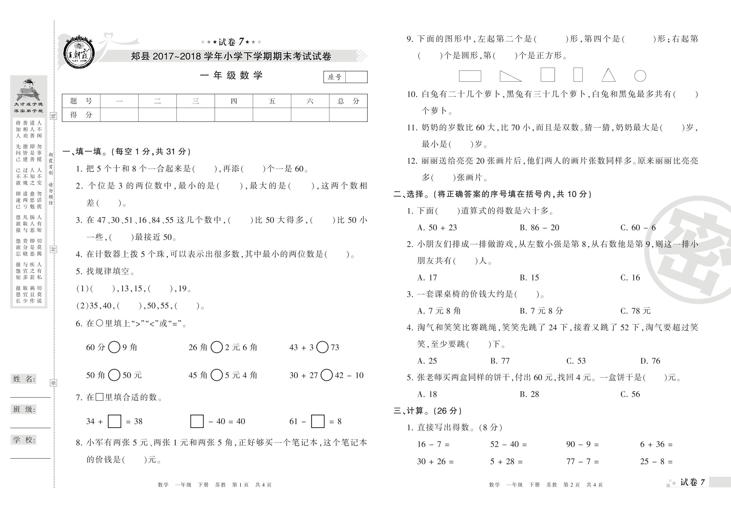 2017-2018学年第二学期平顶山市郏县一年级数学试卷(苏教版)【7】