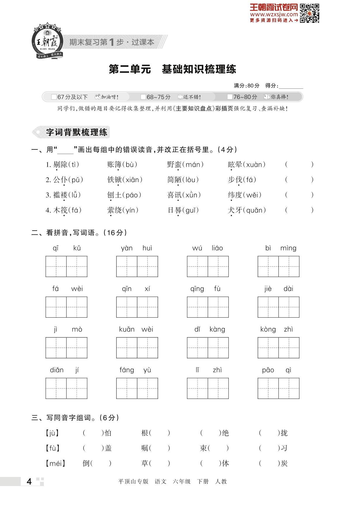 王朝霞期末过课本——第二单元 基础知识梳理练六年级下册语文(人教版)_R230420172128751