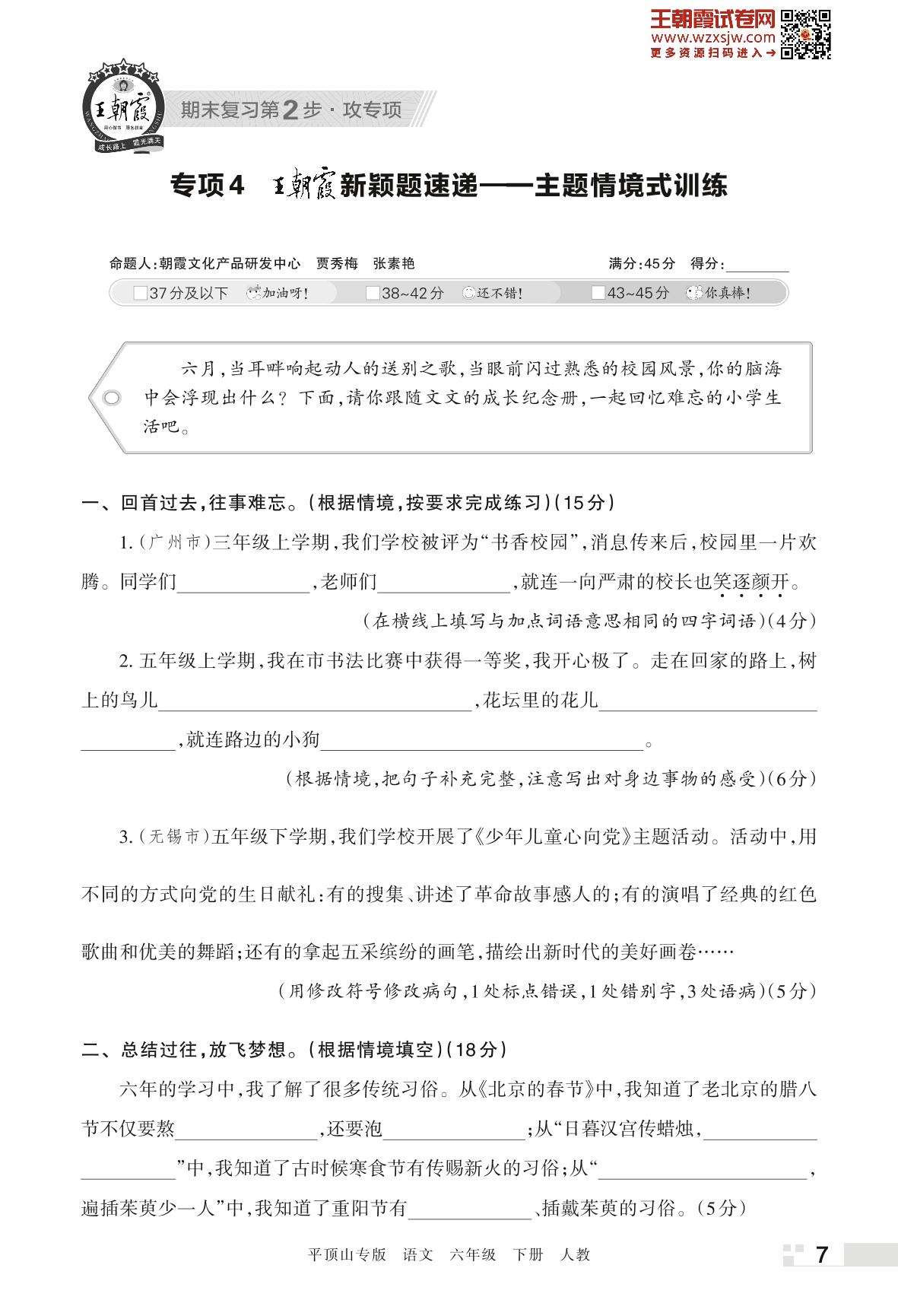 王朝霞期末专项卷——王朝霞新颖题速递:主题情境式训练六年级下册语文(人教版)_R230420172129022【4】