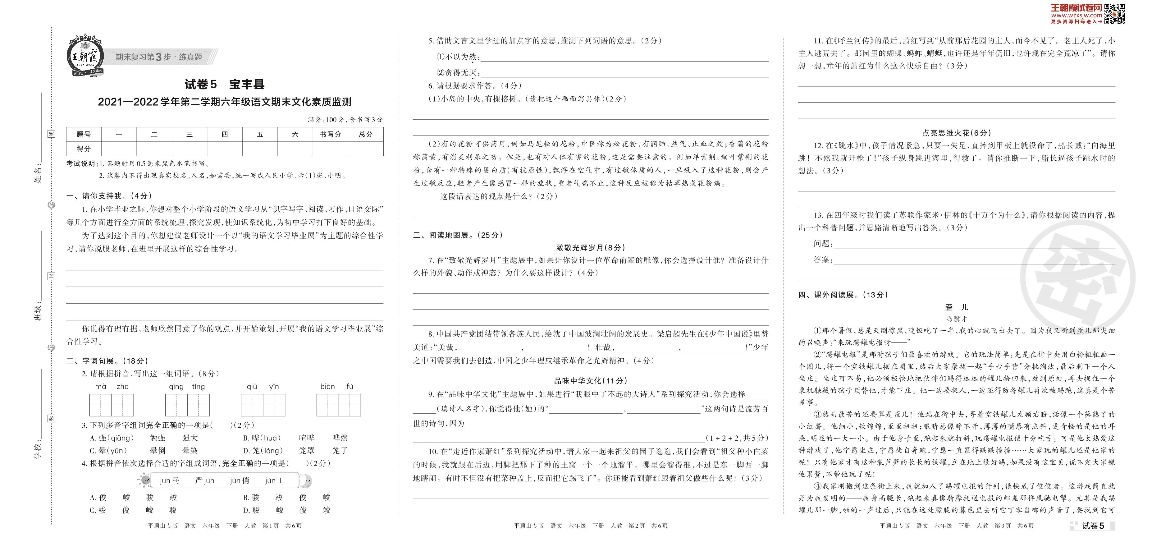 宝丰县2021—2022学年第二学期六年级语文期末文化素质监测(人教版)【5】