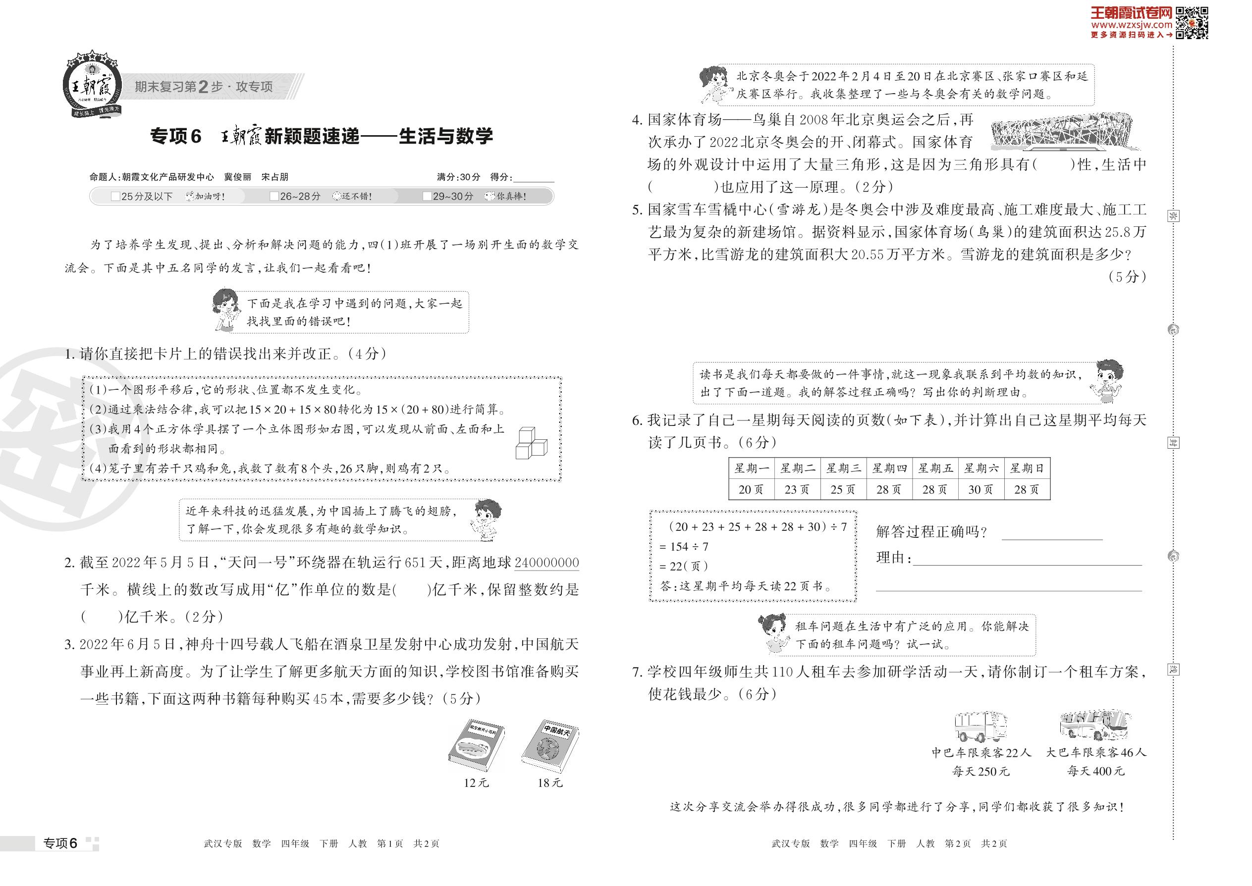 王朝霞期末专项卷——王朝霞新颖题速递:生活与数学四年级下册数学(人教版)_R230420172550936【6】