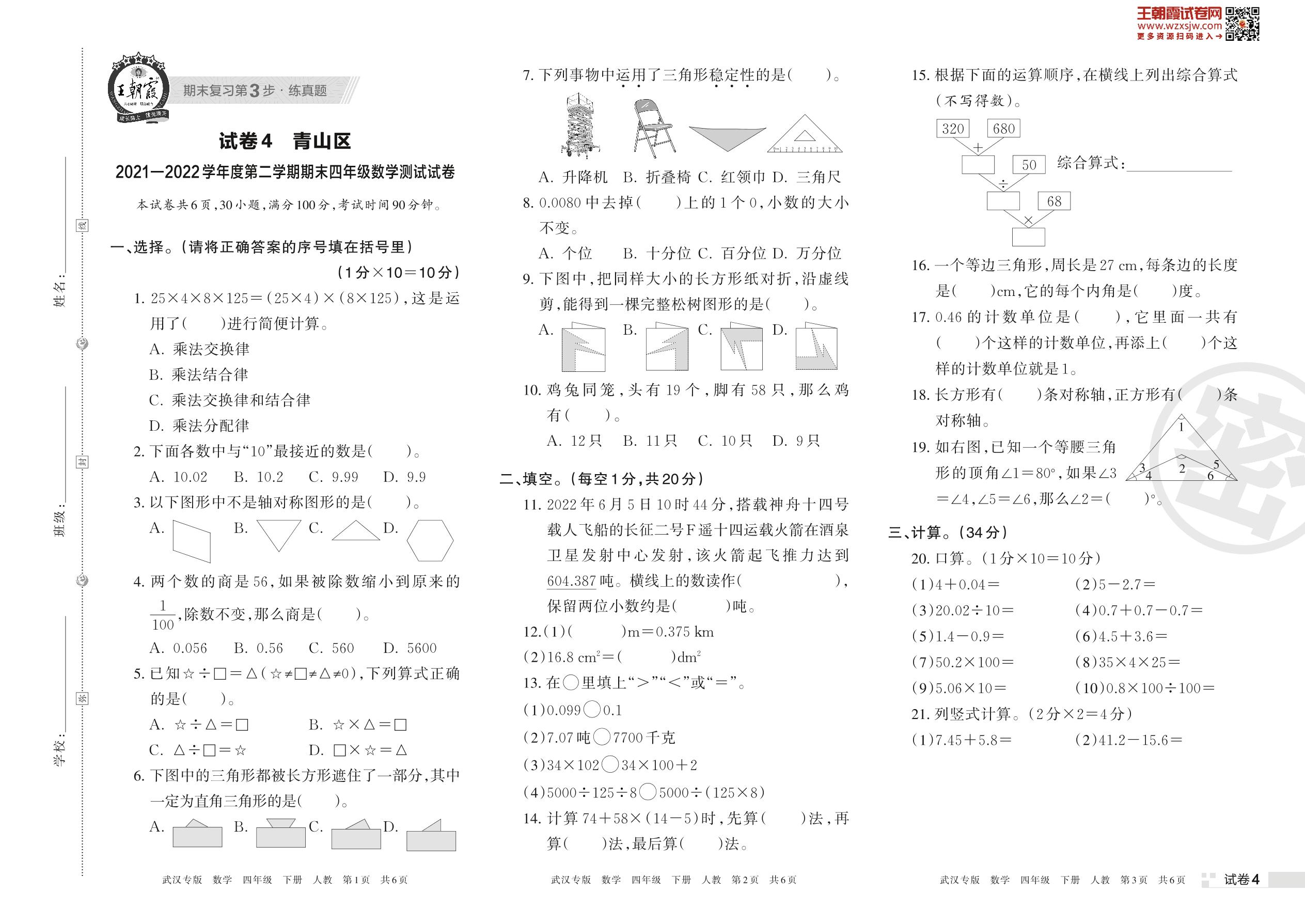 青山区2021—2022学年度第二学期期末四年级数学测试试卷(人教版)【4】