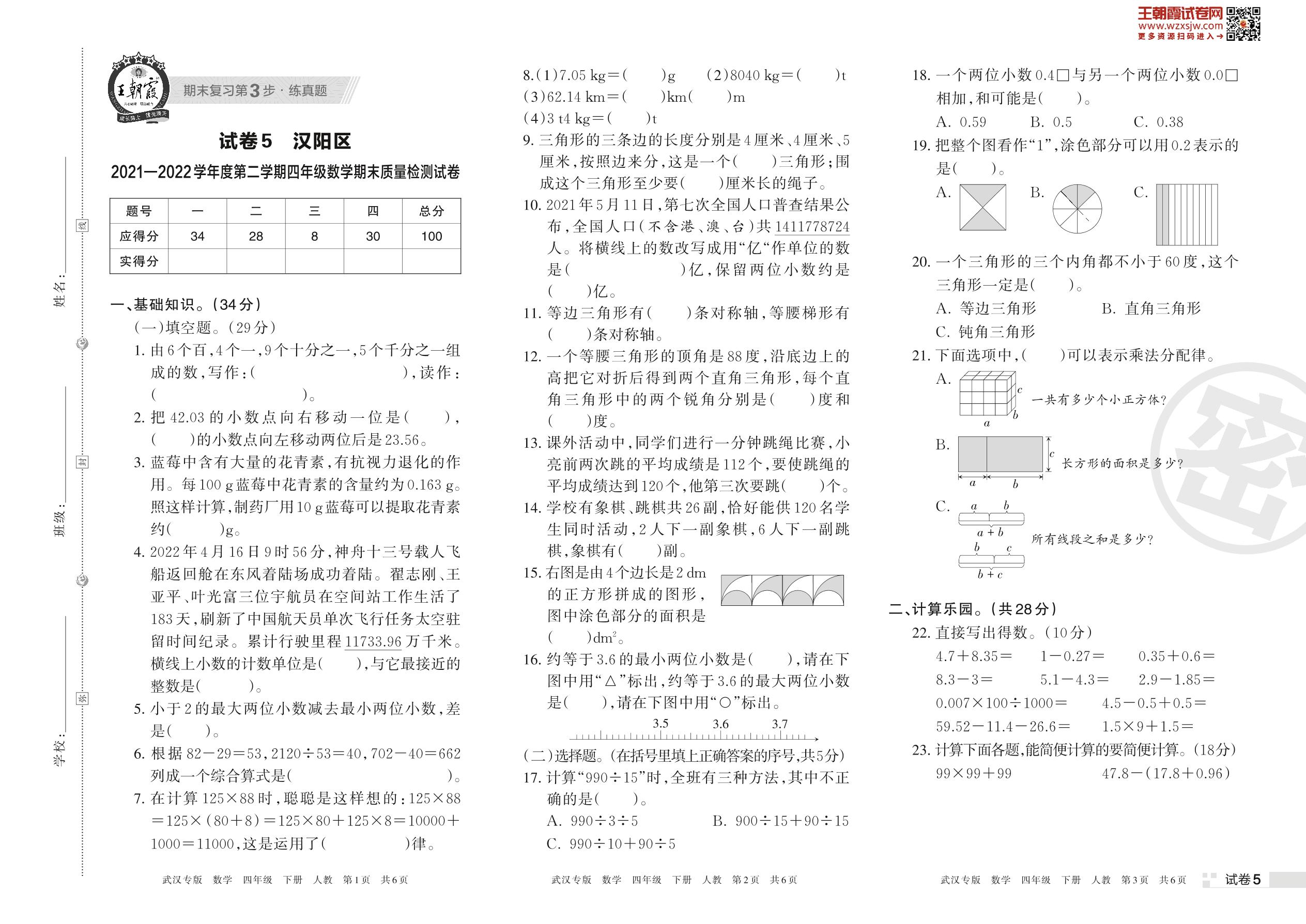 汉阳区2021—2022学年度第二学期四年级数学期末质量检测试(人教版)【5】