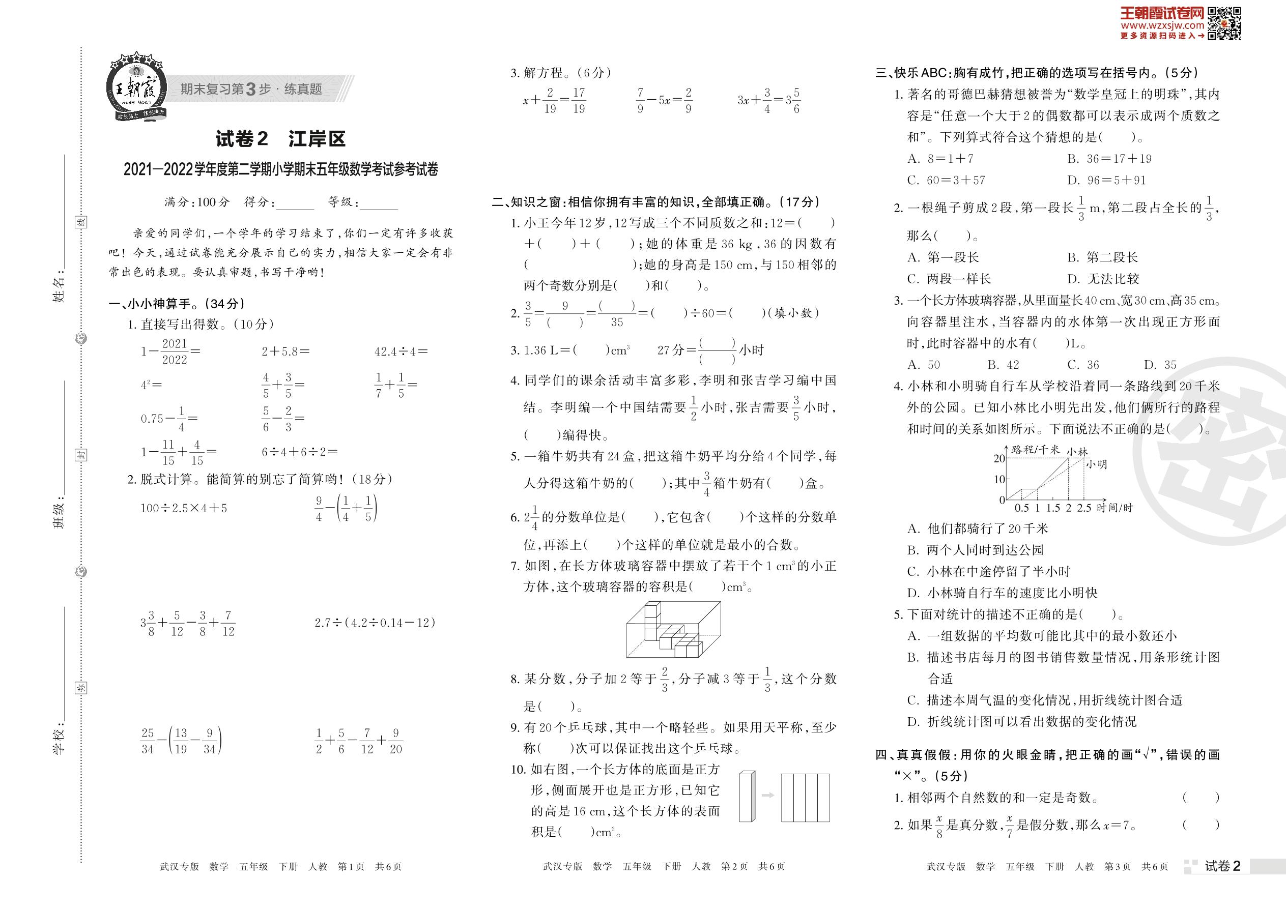 江岸区2021—2022学年度第二学期期末小学五年级数学考试参考试卷(人教版)【2】