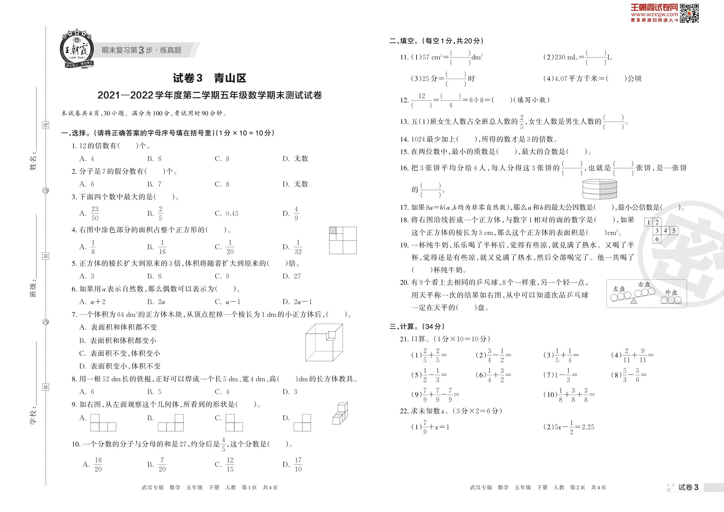 青山区2021—2022学年度第二学期五年级数学期末测试试卷(人教版)【3】