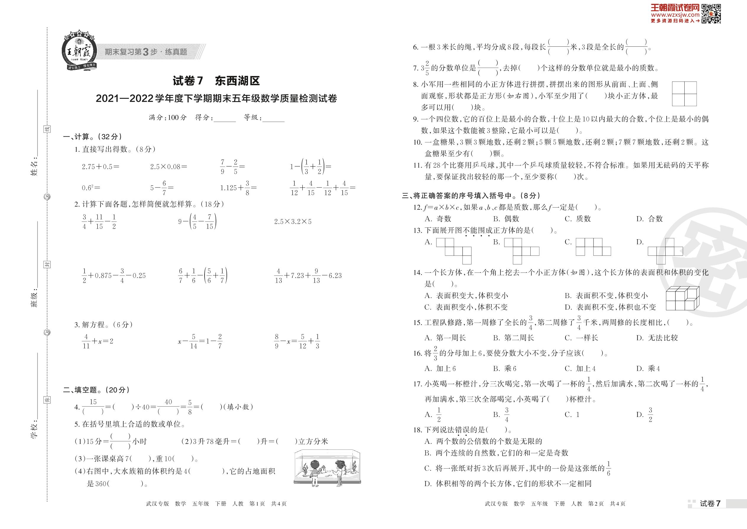 东西湖区2021—2022学年度下学期期末五年级数学质量检测试卷(人教版)【7】