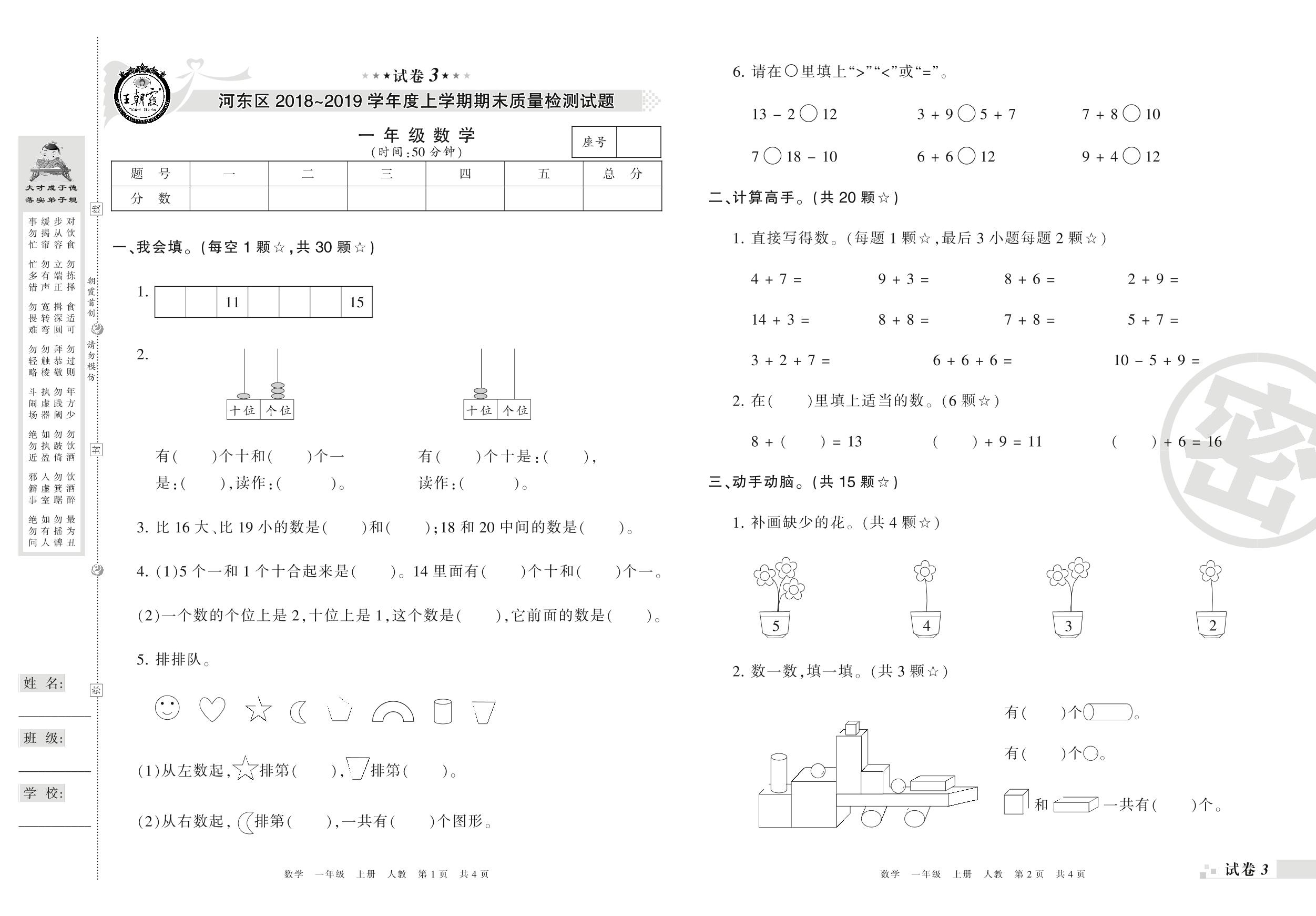 2018-2019学年第一学期临沂市河东区一年级数学试卷(人教版)【3】