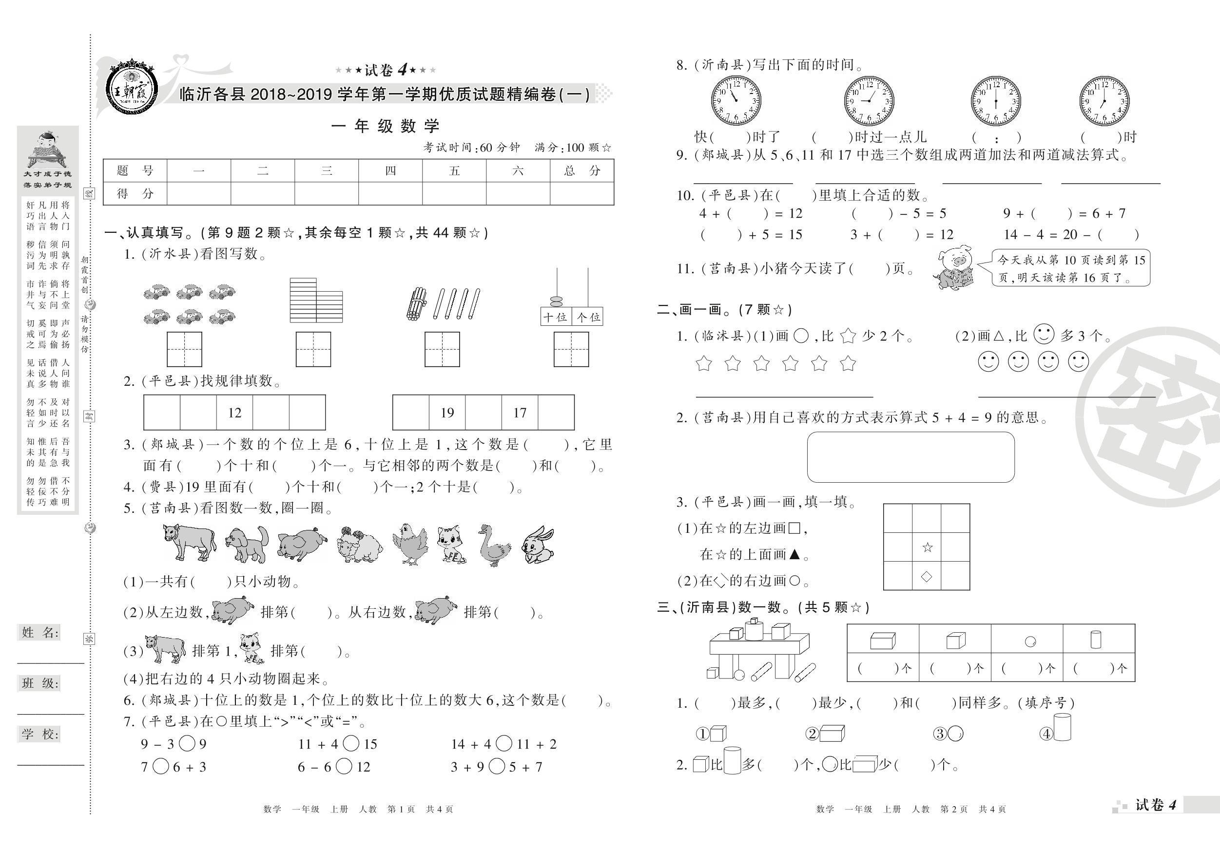 2018-2019学年第一学期临沂市各县优质试题精编卷(一)一年级数学试卷(人教版)【4】