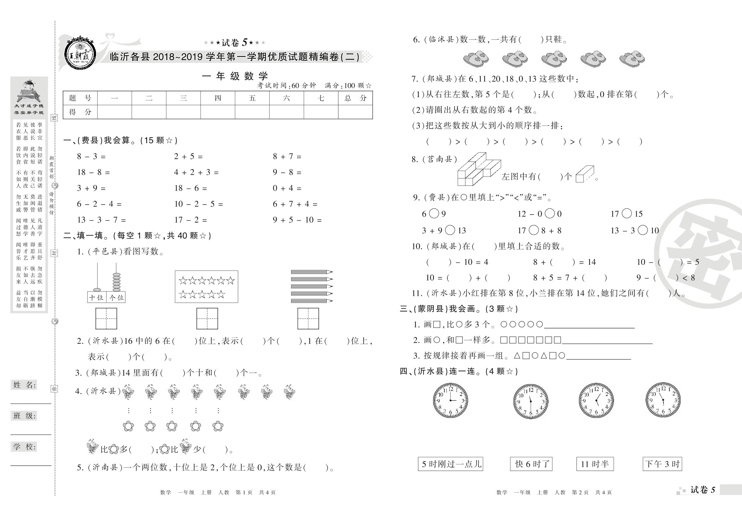 2018-2019学年第一学期临沂市各县优质试题精编卷(二)一年级数学试卷(人教版)【5】