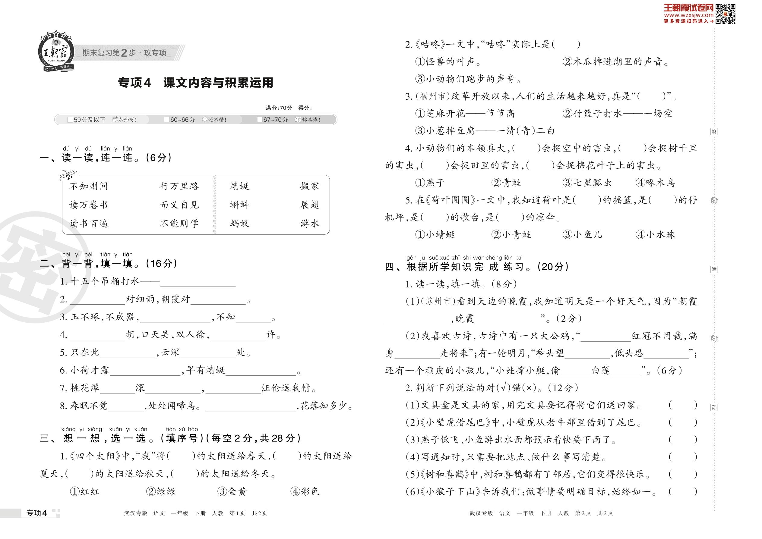 王朝霞期末专项卷——课文内容与积累运用一年级下册语文(人教版)_R230421092815888【4】