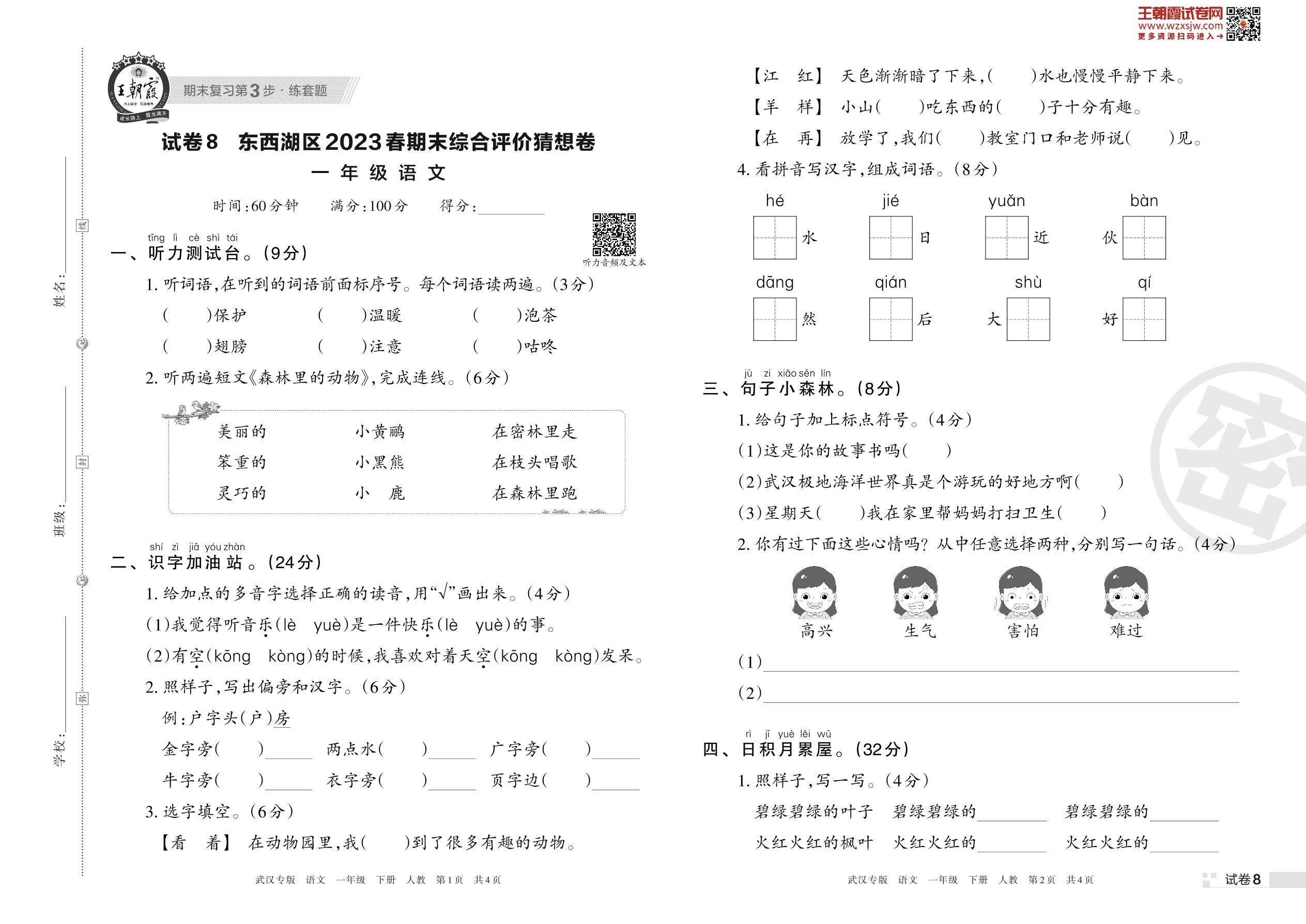 东西湖区2023春期末综合评价猜想卷一年级语文(人教版)【8】