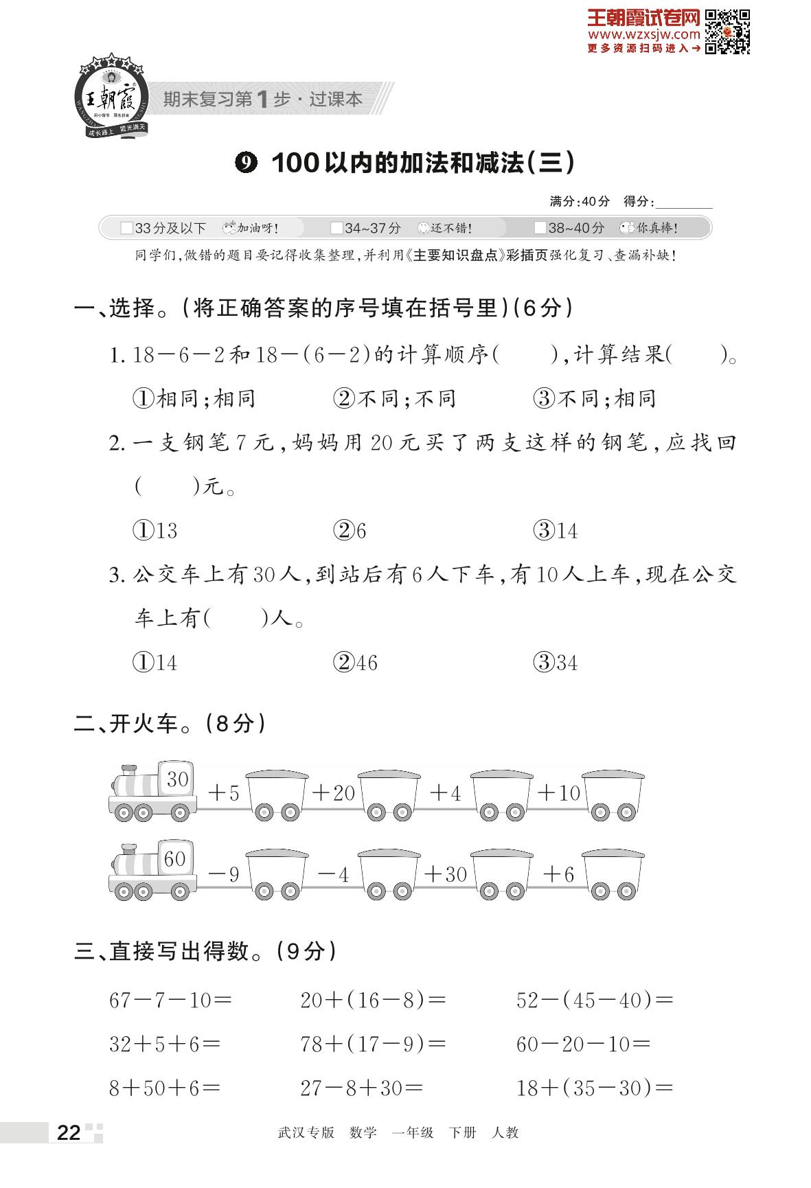 王朝霞期末过课本——9 100以内的加法和减法(三)一年级下册数学(人教版)_R230421093506974