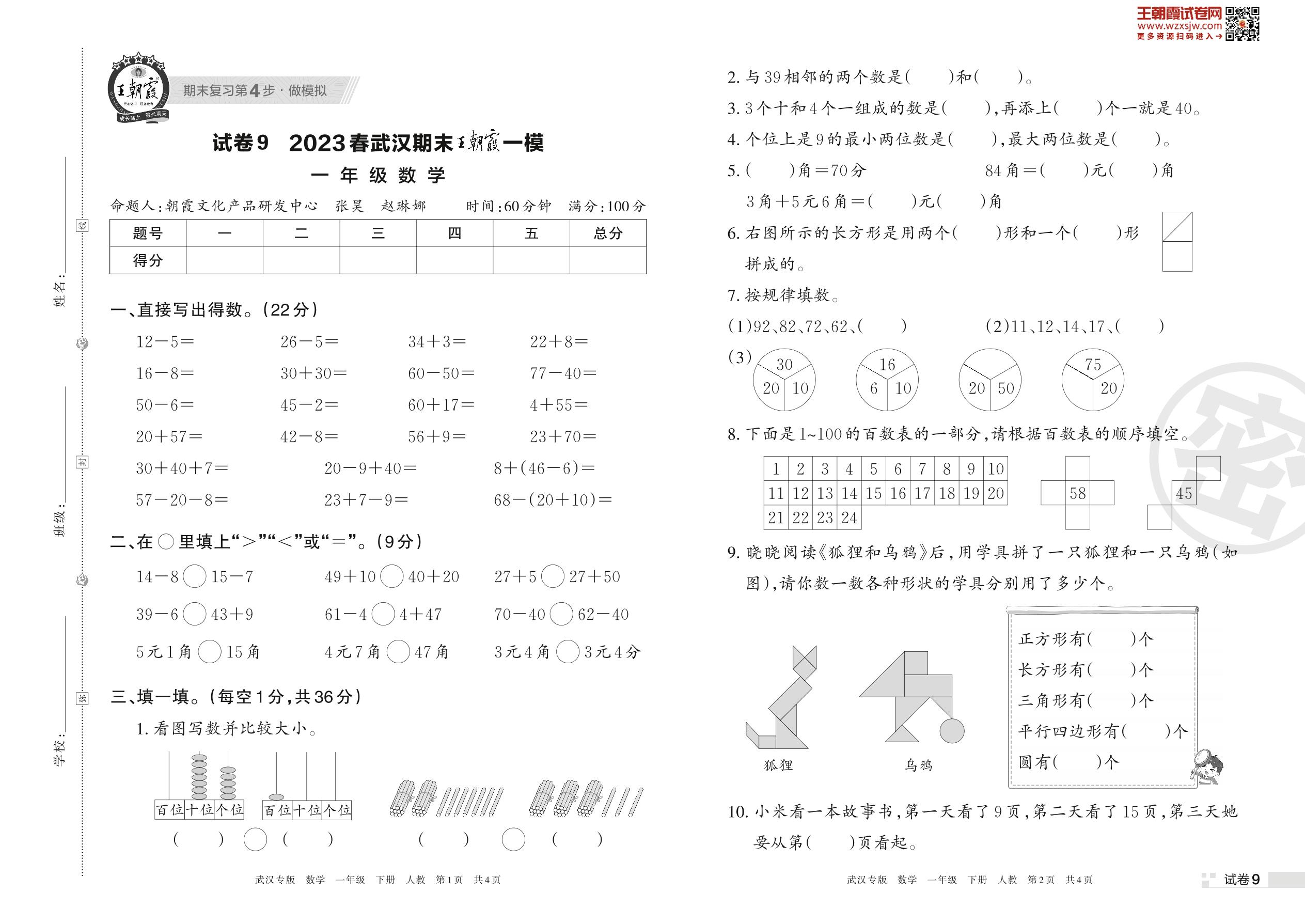 王朝霞期末模拟卷一年级下册数学(人教版)_R230421093509918【9】