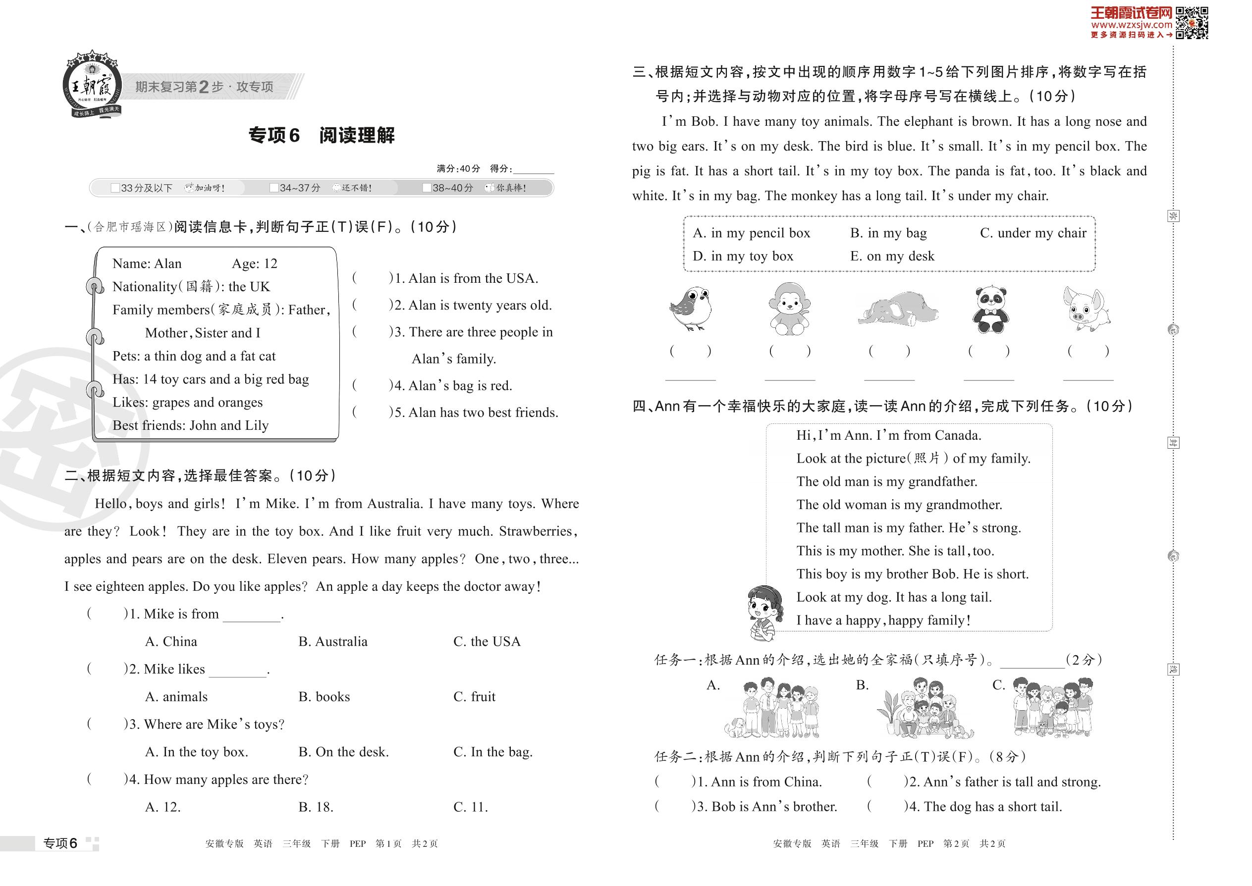 王朝霞期末专项卷——阅读理解三年级下册英语(PEP版)【6】