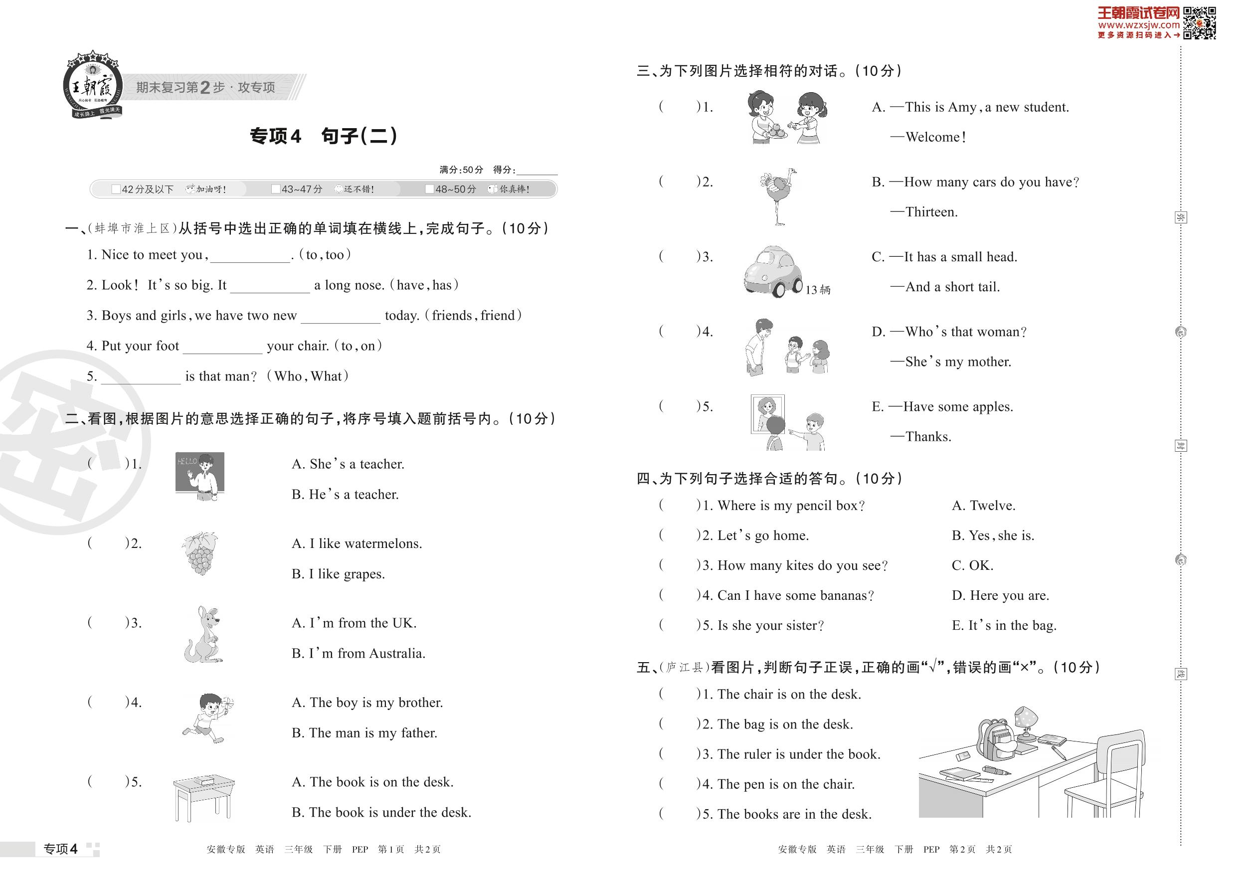 王朝霞期末专项卷——句子(二)三年级下册英语(PEP版)【4】
