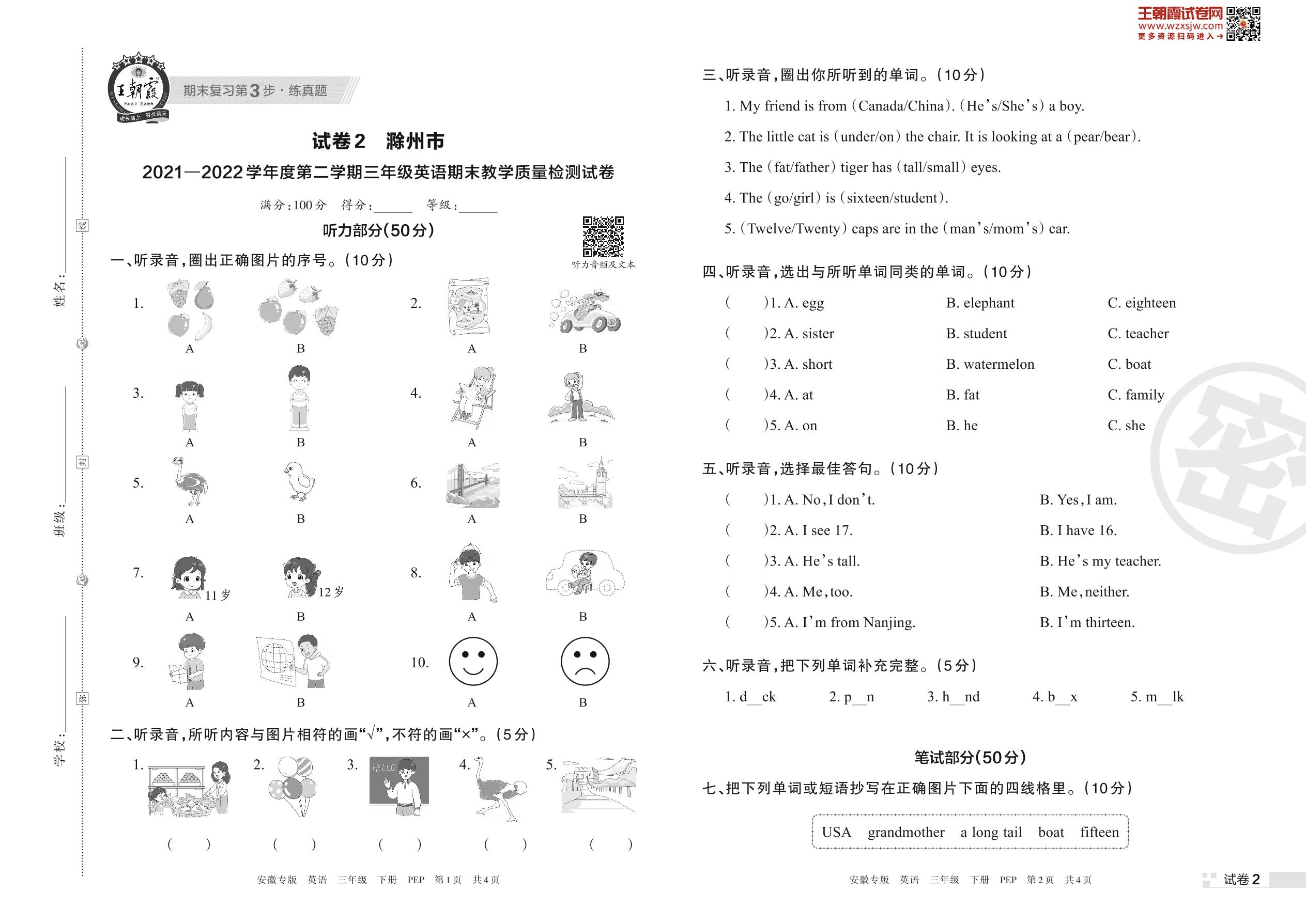 滁州市2021—2022学年度第二学期三年级英语期末教学质量检测试卷(PEP版)【2】