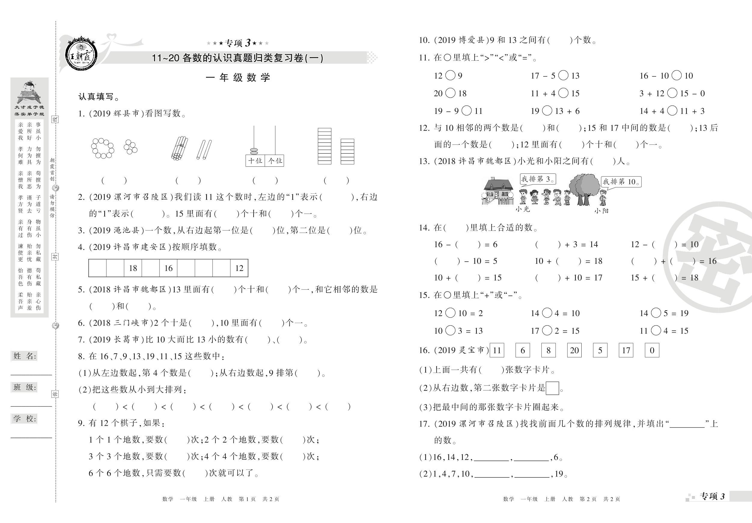 王朝霞期末专项卷——11~20各数的认识真题归类复习一年级上册数学(人教版)_R210802215130【0】