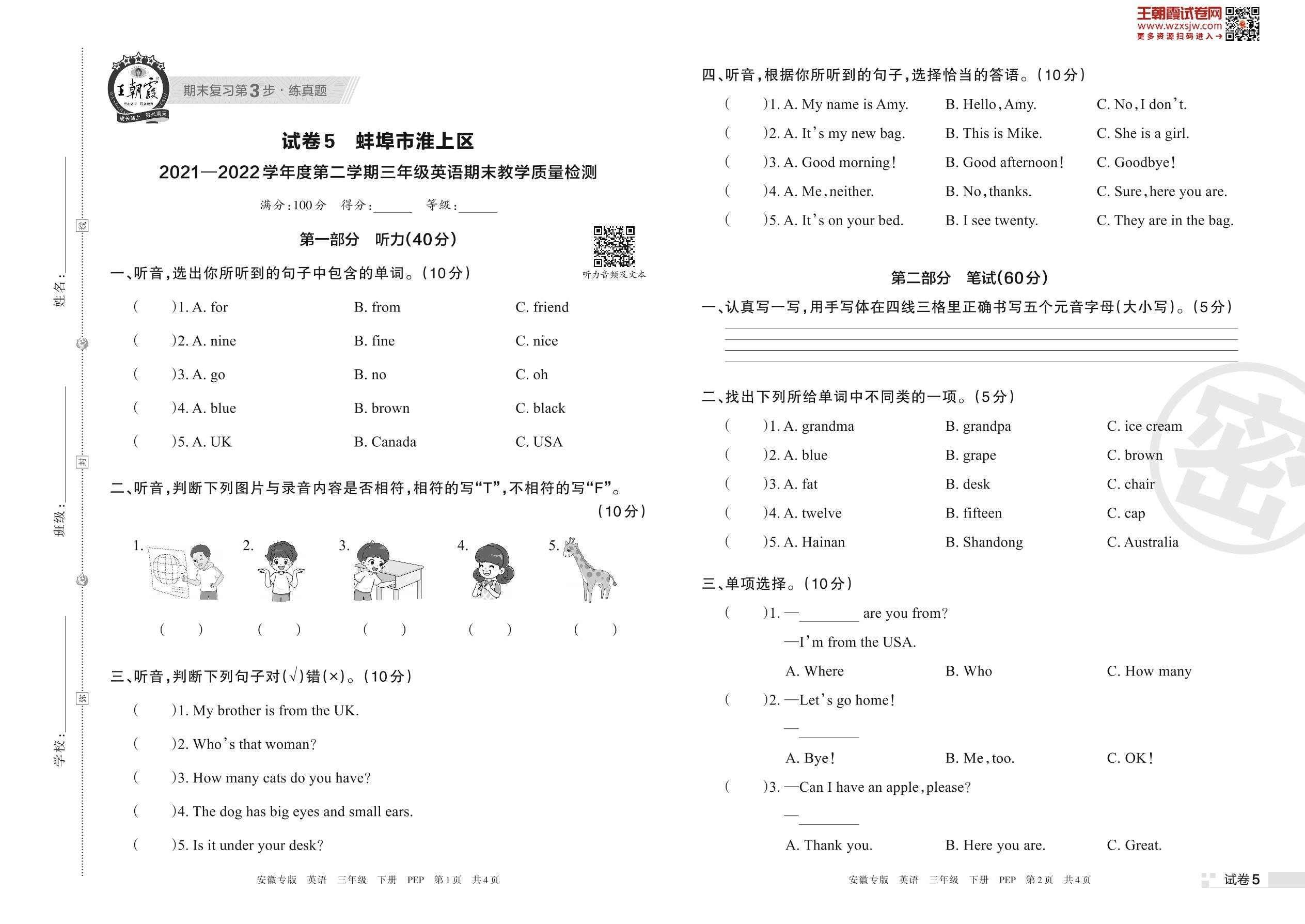 蚌埠市淮上区2021—2022学年度第二学期三年级英语期末教学质量检测(PEP版)【5】