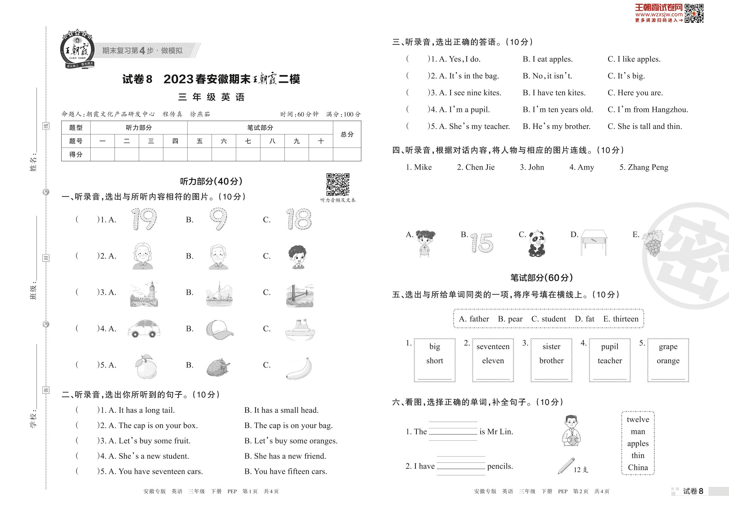 王朝霞期末模拟卷三年级下册英语(PEP版)_R230421104240672【8】