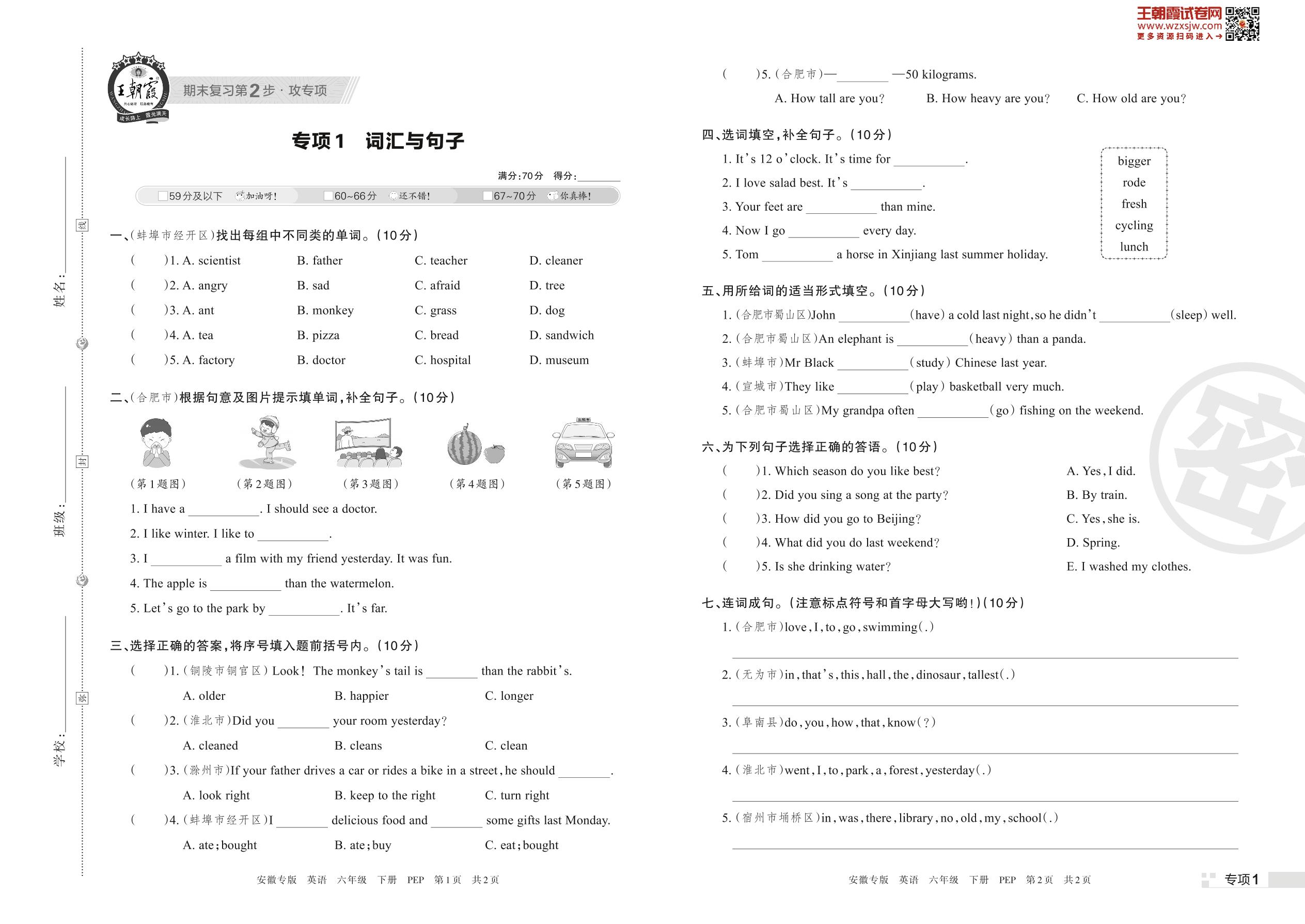 王朝霞期末专项卷——词汇与句子六年级下册英语(PEP版)_R230421104959562【1】