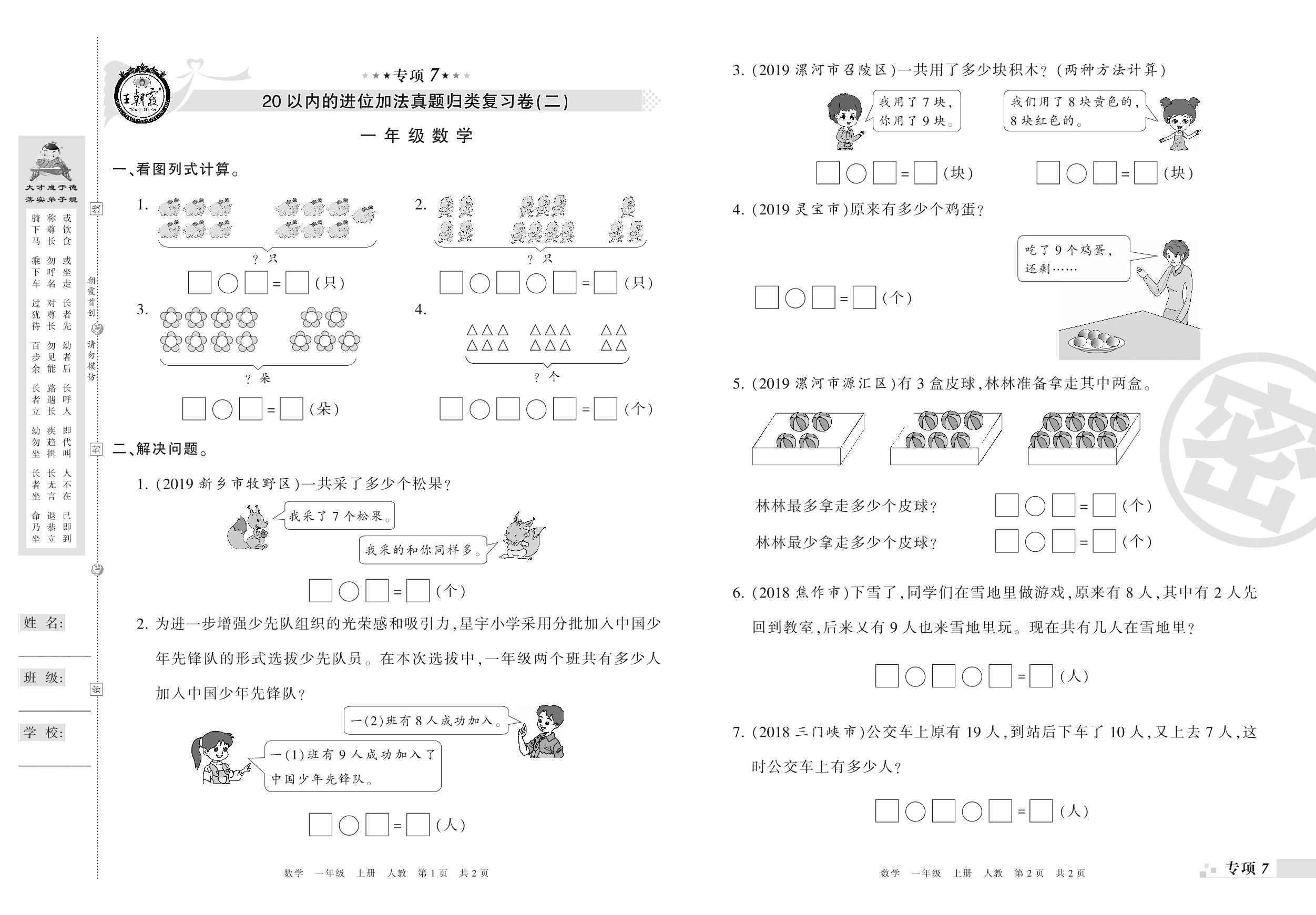 王朝霞期末专项卷——20以内的进位加法、位置、认识图形及钟表真题归类复习一年级上册数学(人教版)_R210802215138【0】