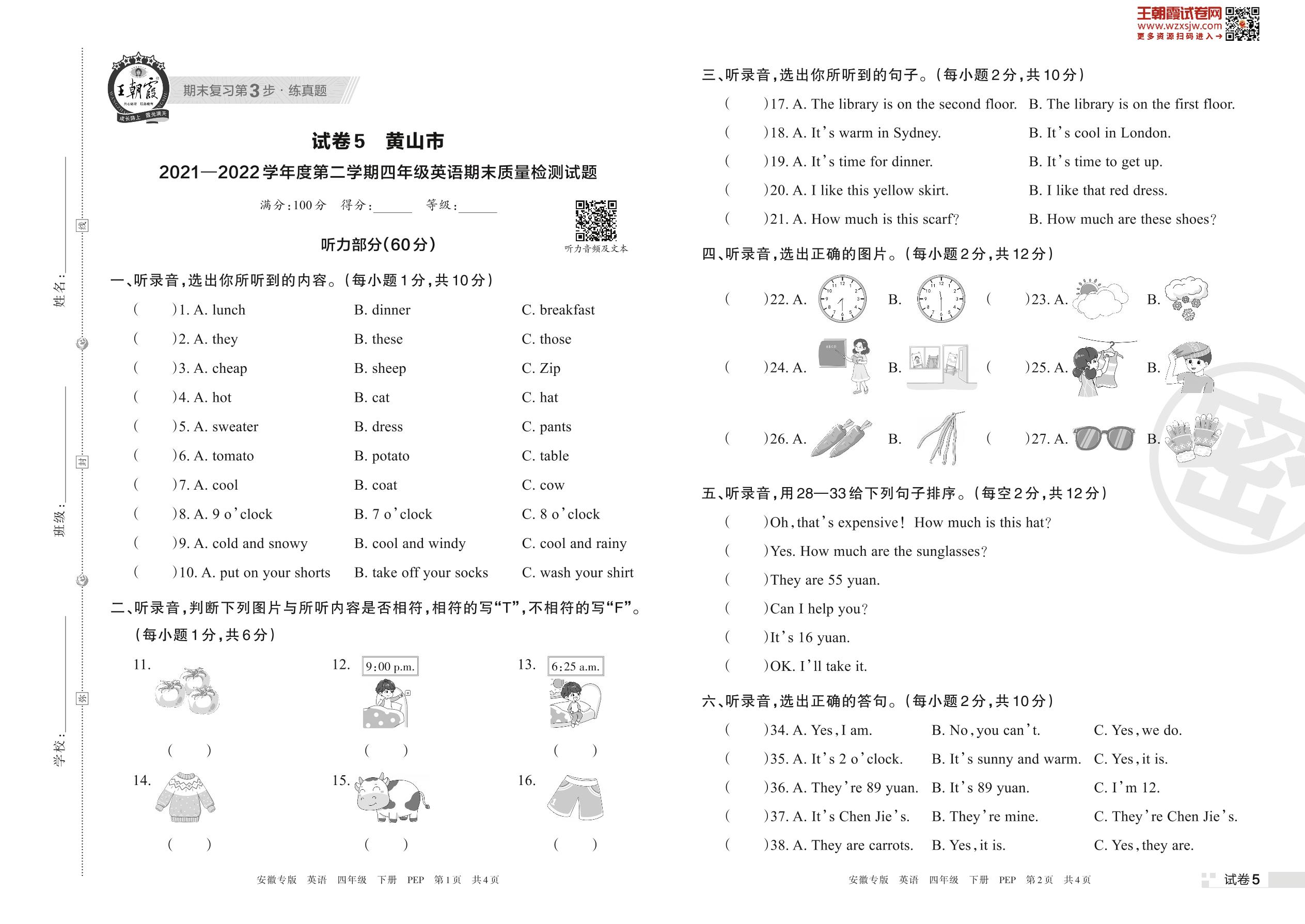 黄山市2021—2022学年度第二学期四年级英语期末质量检测试题(PEP版)【5】