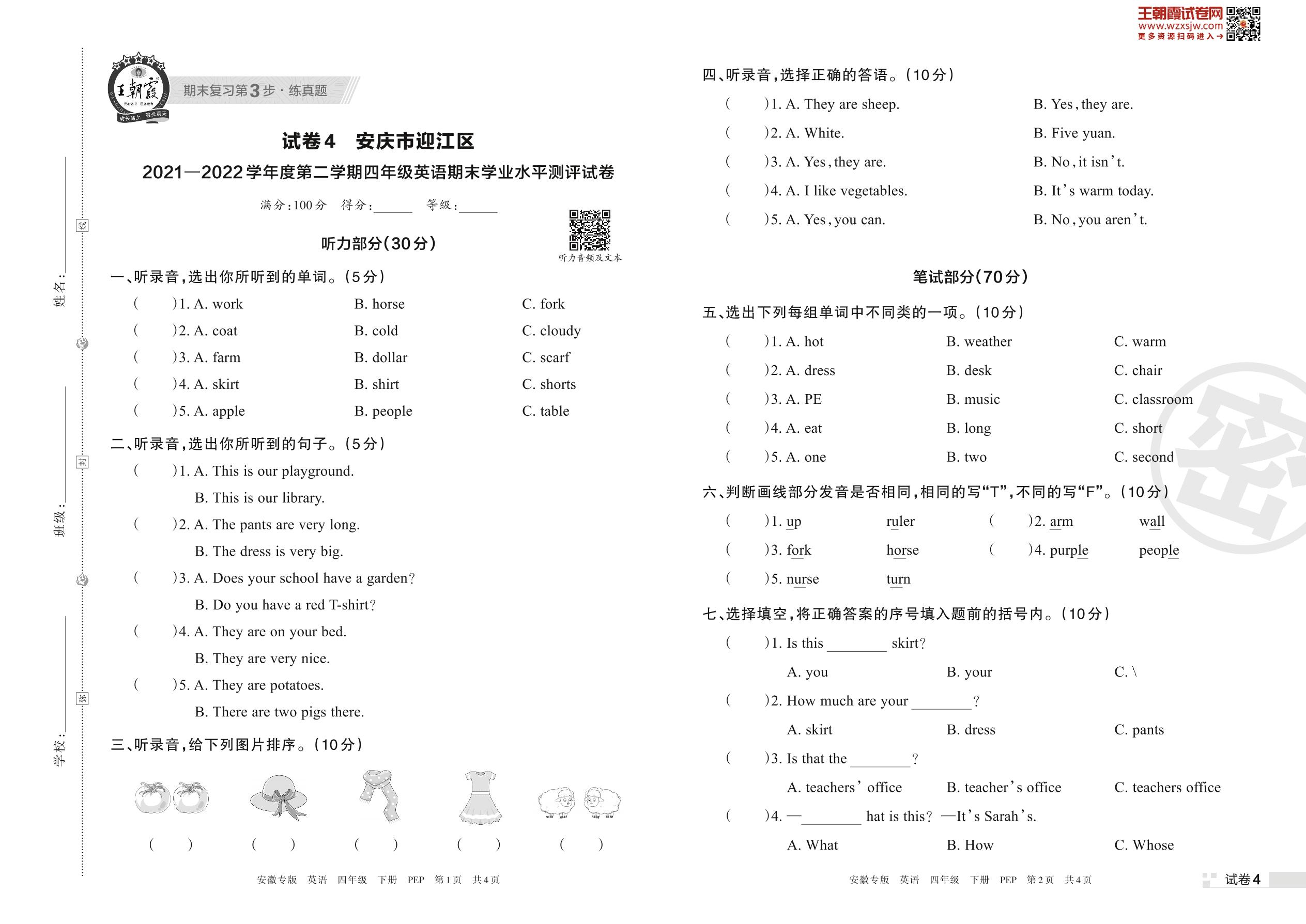 安庆市迎江区2021—2022学年度第二学期四年级英语期末学业水平测评试卷(PEP版)【4】