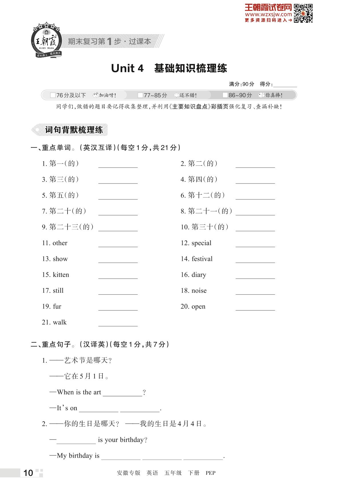 王朝霞期末过课本——Unit 4 基础知识梳理练五年级下册英语(PEP版)_R230421111859269