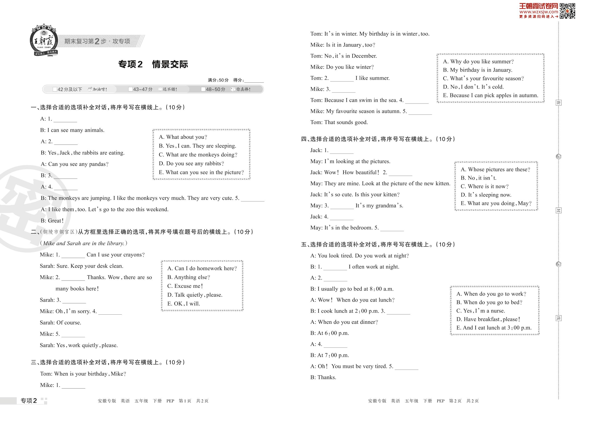 王朝霞期末专项卷——情景交际五年级下册英语(PEP版)_R230421111859792【2】