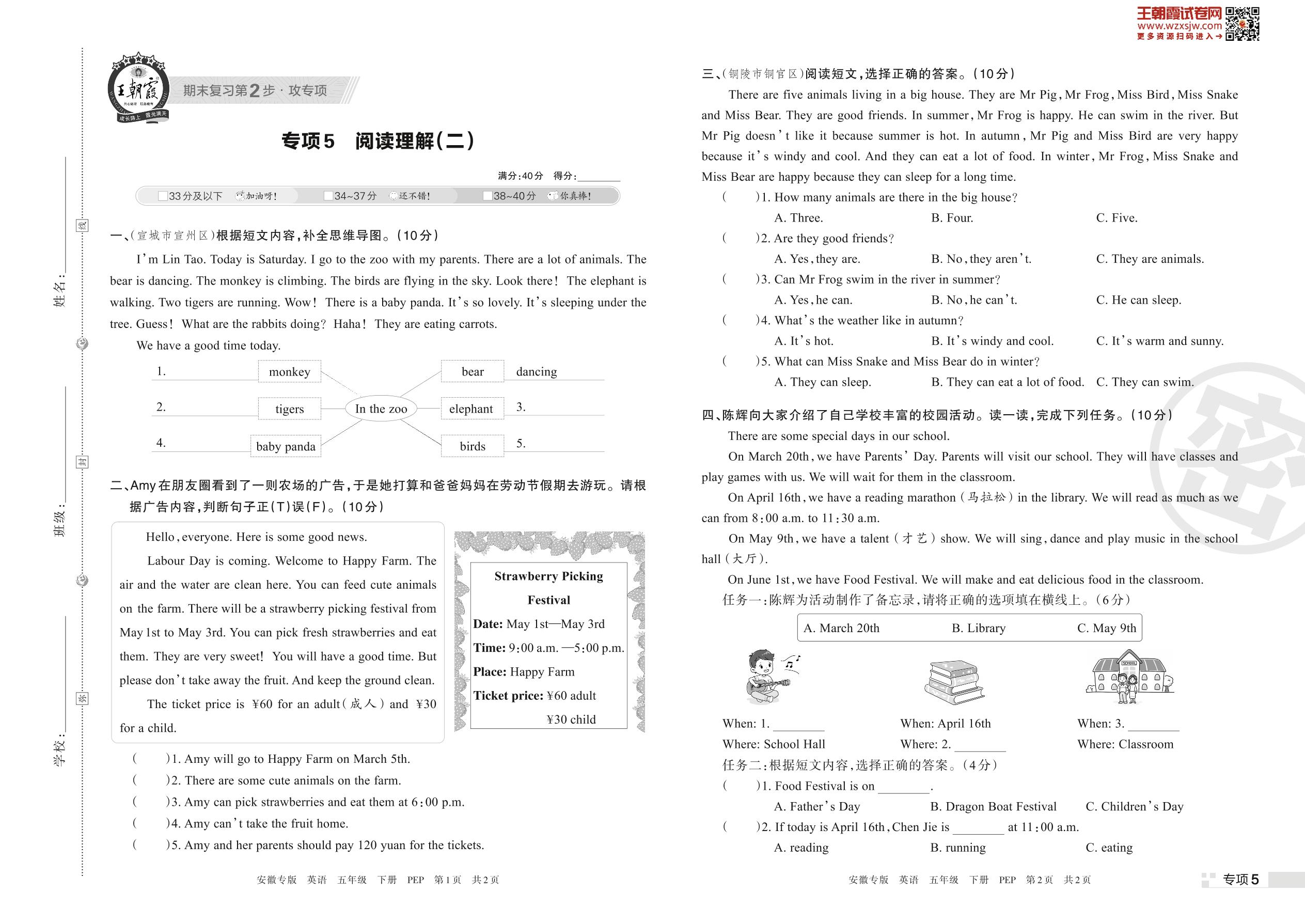 王朝霞期末专项卷——阅读理解(二)五年级下册英语(PEP版)_R230421111859645【5】