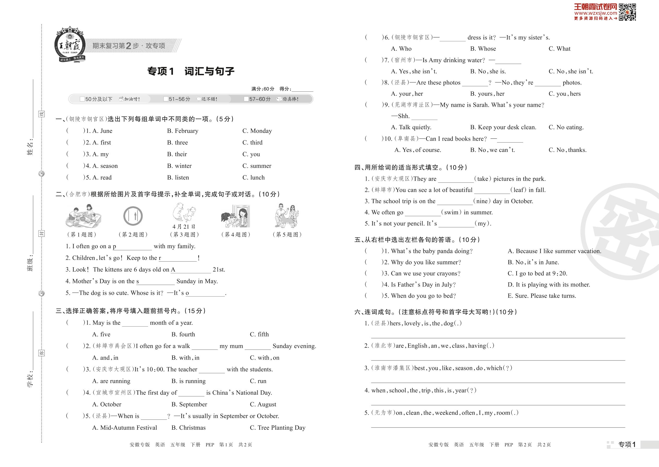 王朝霞期末专项卷——词汇与句子五年级下册英语(PEP版)_R230421111900357【1】