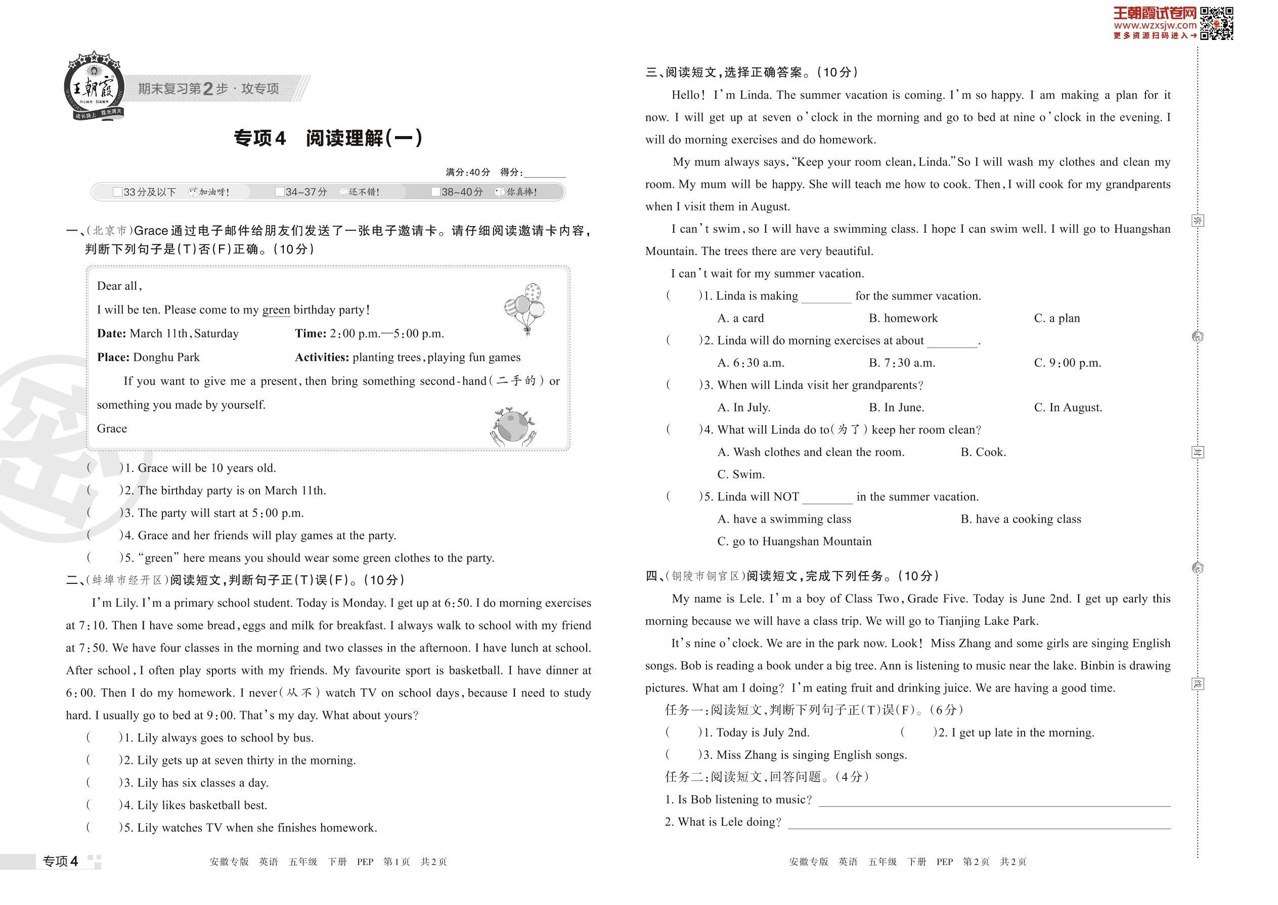 王朝霞期末专项卷——阅读理解(一)五年级下册英语(PEP版)_R230421111900943【4】