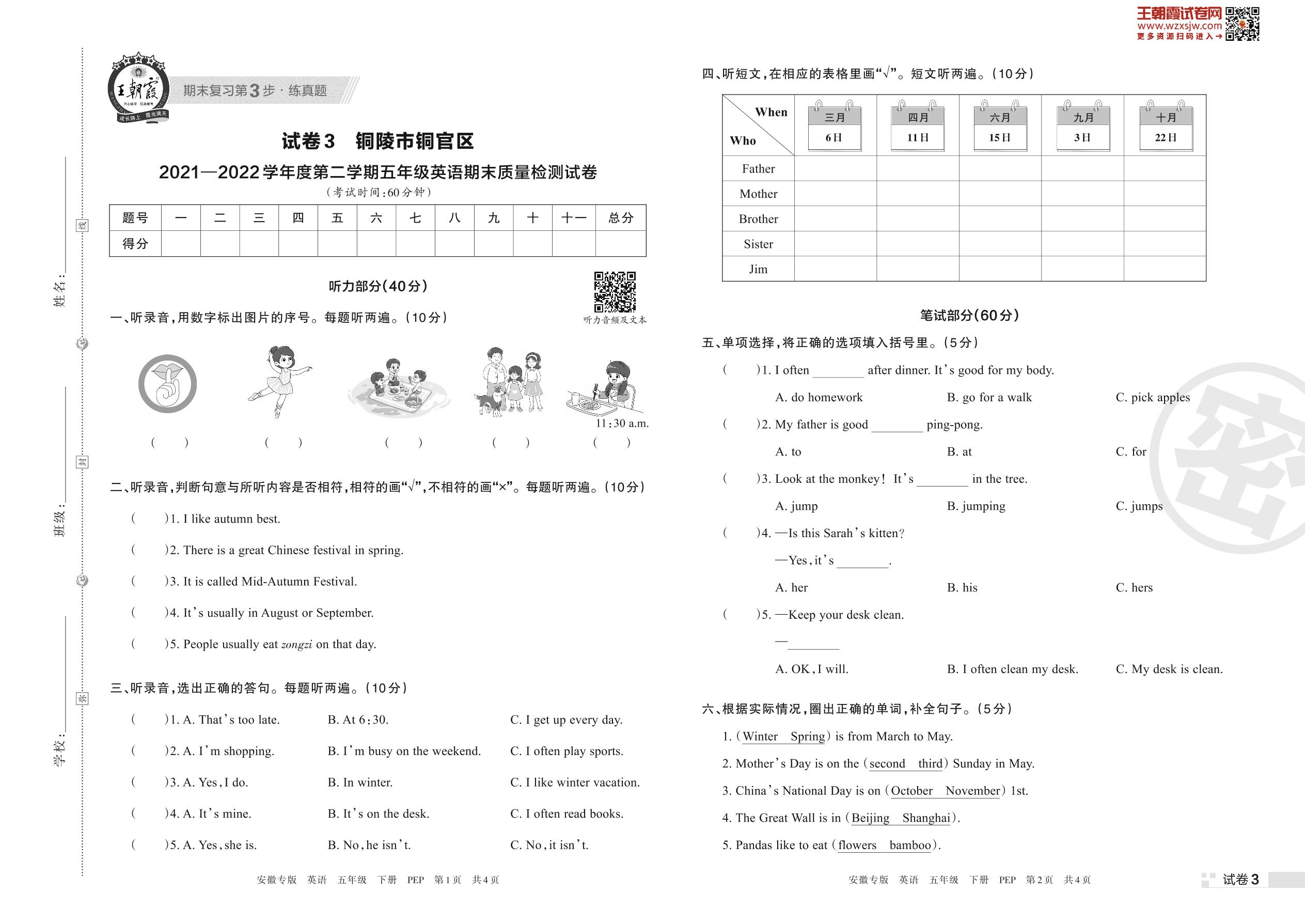 铜陵市铜官区2021—2022学年度第二学期五年级英语期末质量检测试卷(PEP版)【3】