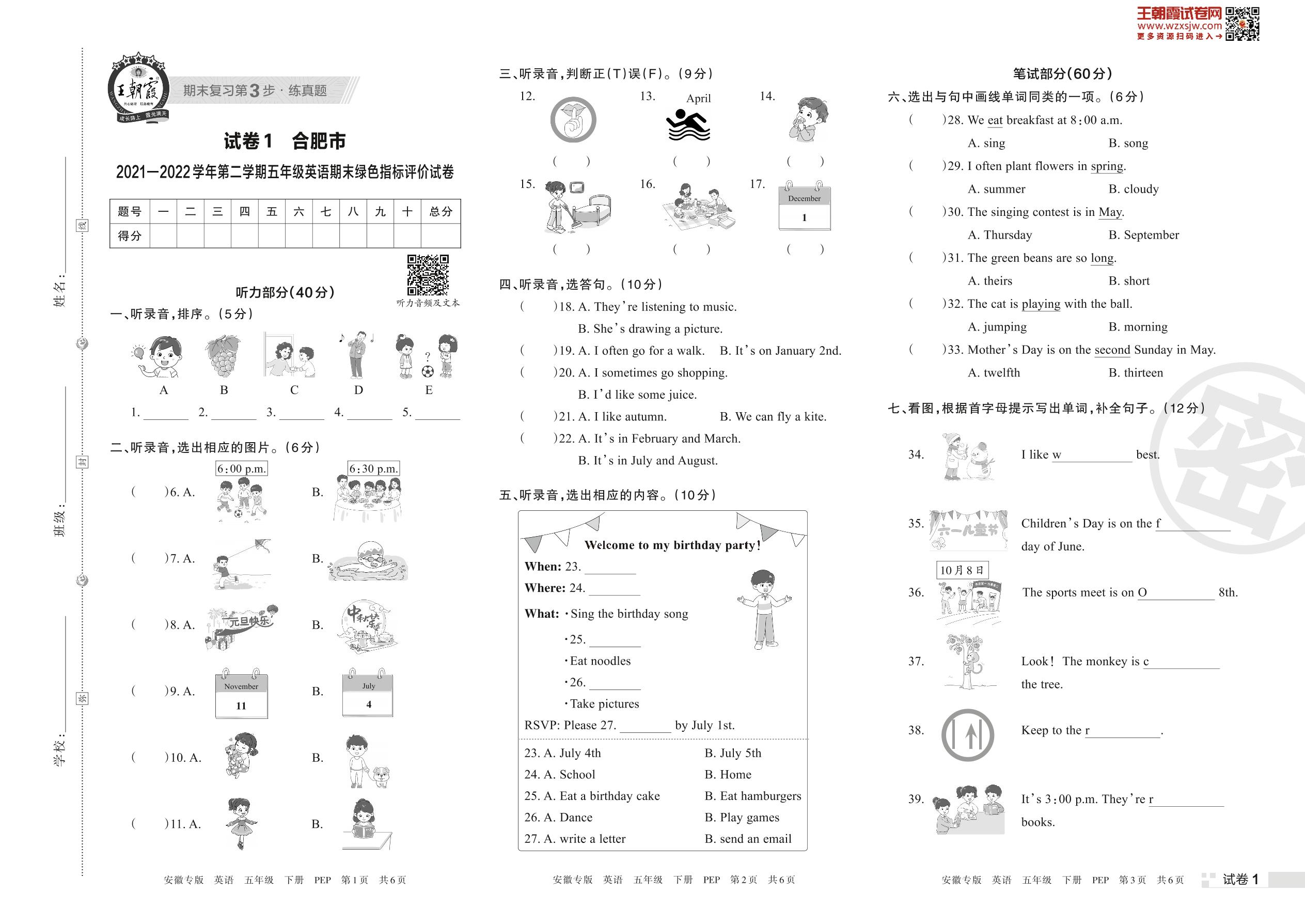 合肥市2021—2022学年第二学期五年级英语期末绿色指标评价试卷(PEP版)【1】