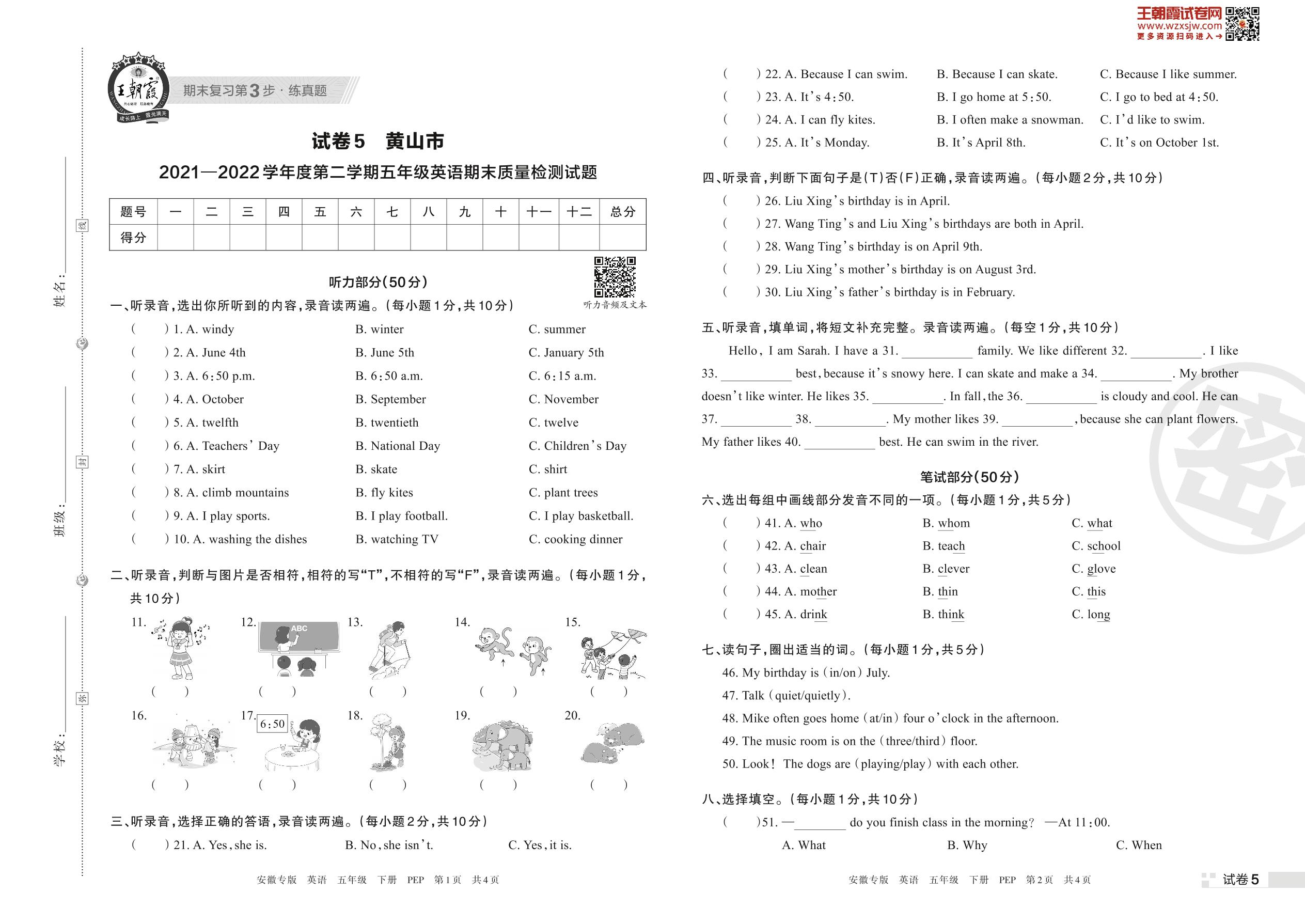 黄山市2021—2022学年度第二学期五年级英语期末质量检测试题(PEP版)【5】