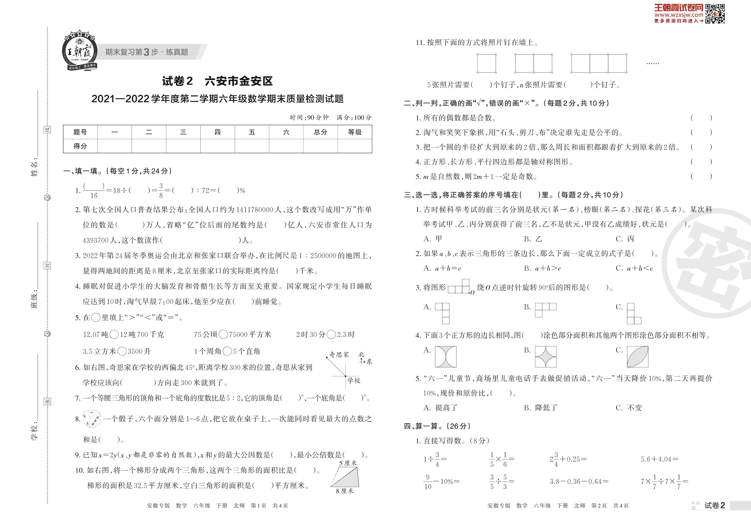 六安市金安区2021—2022学年度第二学期六年级数学期末质量检测试题(北师版)【2】